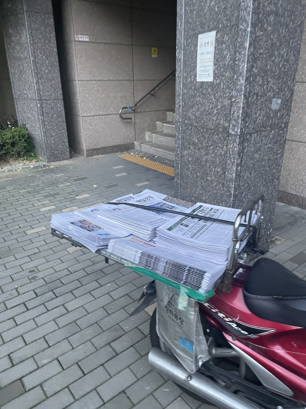 9월 22일. 아침 일찍 판교로 향했다. 아침 8시 40분에 행사가 하나 있었기 때문이다. 멀리 떠날 때는 근처 스타벅스 오픈 시간(7시)를 기준으로 도착 시간을 맞추고 집에서 출발을 한다. 출근길의 혼자함을 피하려는 이유도 있고 도착해서 업무 볼 공간이 필요하기 때문이다. 집을 나서는데 아침 일찍 신문을 배달하는 풍경이 눈에 들어온다. 평소라면 그냥 지나쳤겠지만 이 날은 곧 사라질 풍경이라는 생각이 들어서 사진으로 남겼다.