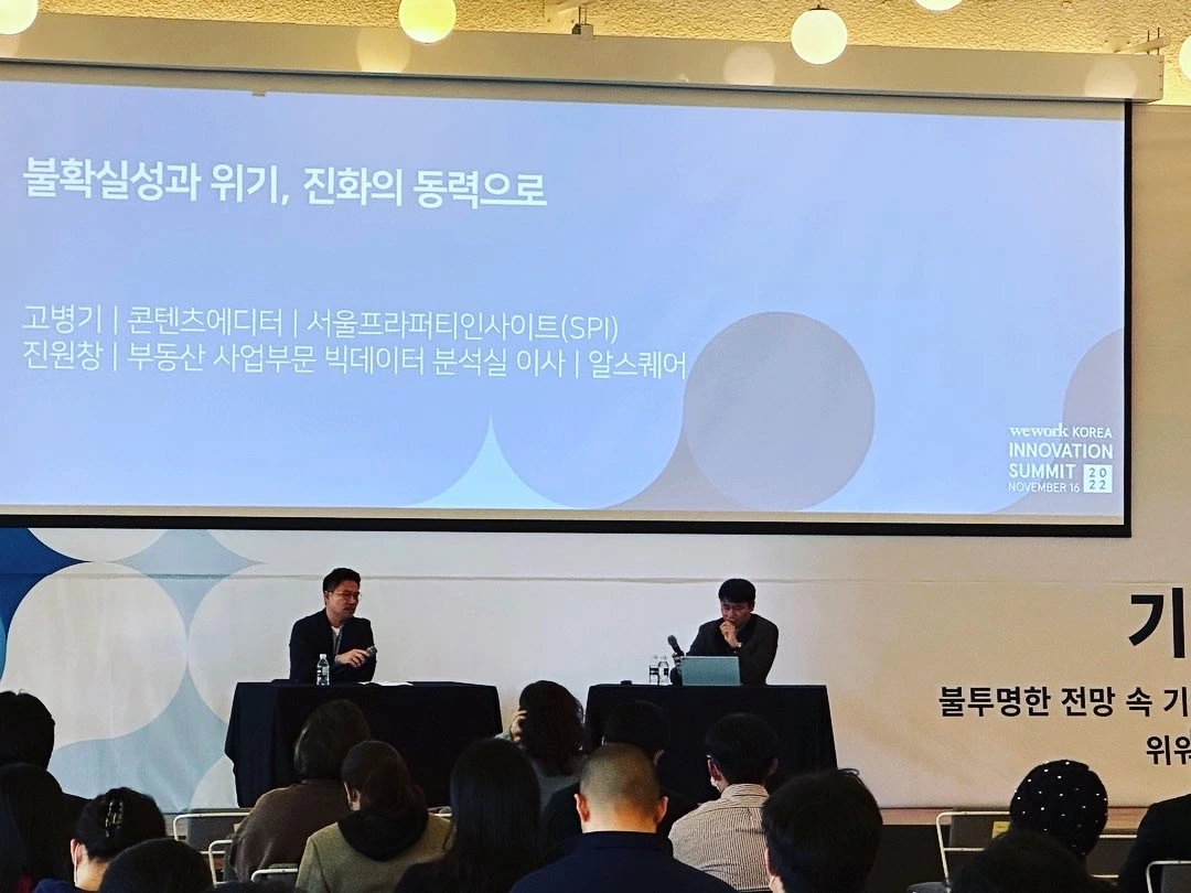 오랜만에 위워크와 함께 행사를 했다. 위워크가 일 년에 한 번씩 매년 이맘때 하는 세미나인데 알스퀘어의 진원창 이사님과 함께 상업용 부동산 세미나 세션을 맡았다. 다른 세션은 모더레이터가 있었는데 우리가 맡았던 세션은 2018년부터 진행 중인 팟캐스트(고병기 기자가 들려주는 상업용 부동산 이야기) 형식으로 내가 발제자이면서 모더레이터 역할을 했다. 진 이사님이 주요 이슈 다섯 가지를 소개하고 그 이슈를 듣고 질문도 하고, 이어서 발제도 했다. 30분이라는 시간이 길지 않아 막판에 말을 좀 빠르게 하긴 해야 했지만 어쨌든 오랜만에 위워크와 함께 한 행사도 잘 마무리가 된 것 같다. 이제 다음주에 위워크로부터 사진, 동영상 등을 받아 팟캐스트와 유튜브 'Seoul Property Insight TV'에도 올릴 예정이다.