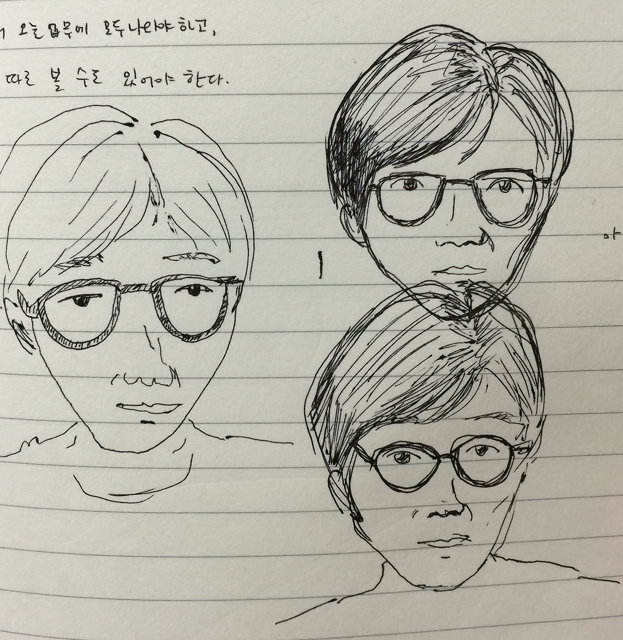 일단 동영상이 저에게 자신감을 주더군요. 다른 사람들의 영상을 보니까 개발세발이었는데 몇 전 더 그리니 잘 하더군요. 그리고 자기만의 스타일을 찾더니 더 잘 그리게 되는 것이었습니다. 그래서 저도 내친김에 제 동영상을 보고 저를 그려보기로 했습니다. 세 번 그려보았습니다. 맨 처음 그린 것이 왼쪽 그 다음이 오른쪽, 그리고 그나마 나아진게 세 번째 그린겁니다. 이건 정말 절 닮았어요. 허허. 두번짼 유재석을 닮았네요. 저것도 분명 나인데.