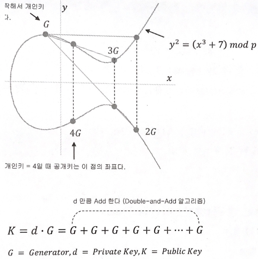 secp256k1 표준에 정의된 타원곡선 함수식과 곡선상의 한 점인 G(베이스 포인트, 공개키를 만드는 시작점)를 이용한다. 타원 곡선의 덧셈 연산자를 사용하면 베이스 포인트에 G를 계속 더한 지점은 2G, 3G, 4G, …가 된다.