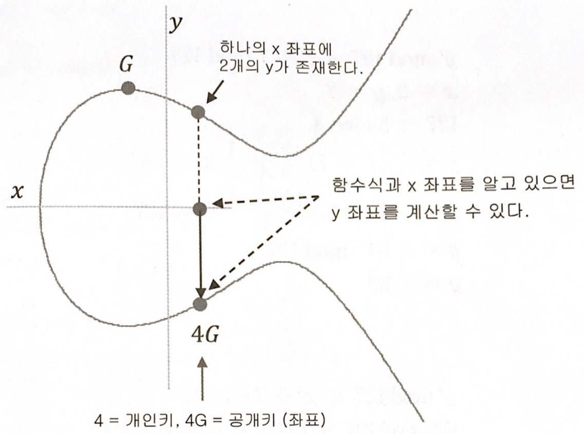 타원곡선은 x축에 대칭이므로 한 x 좌표값에 y값이 2개 존재한다. 이것이 위의 압축 포맷에서 y좌표가 짝수인 경우와 홀수인 경우를 구분한 이유이다.