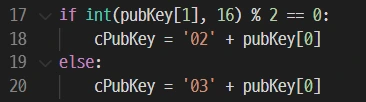 압축 포맷의 공개키 길이 : 0x02/0x03(8비트) + x좌표(256비트) = 264비트