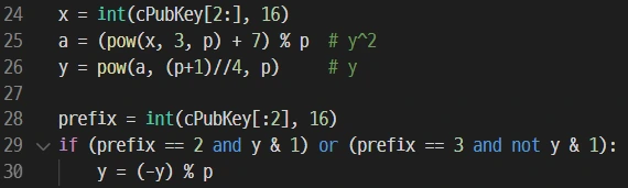 압축 포맷의 공개키를 비압축 포맷으로 변환하려면 주어진 타원곡선의 함수식에 압축 포맷의 x 좌표 값을 대입해서 y 값을 계산한 후, x, y값을 이용해 비압축 포맷으로 나타내면 된다.