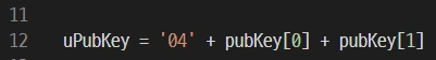 비압축 포맷의 공개키 길이 : 0x04(8비트) + x좌표(256비트) + y좌표(256비트) = 520비트