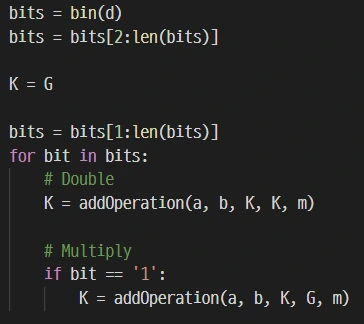 공개키를 계산할 때 개인키는 256비트의 매우 큰 수이므로 Double-and-Add알고리즘을 사용한다. Double-and-Add알고리즘은 덧셈을 수행할 때 2의 거듭제곱을 이용해 큰 수를 더 빠르게 더하는 알고리즘이다. 따라서 점 G를 매우 큰 수만큼 더해도 빠른 속도로 값을 계산할 수 있다.