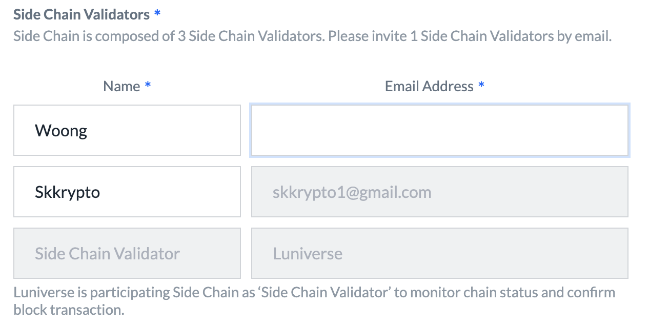 Chain 이름과 간단한 설명을 기입한 후 가장 중요한 side chain validator을 설정해야합니다. 3개의 validator를 설정할 수 있는데