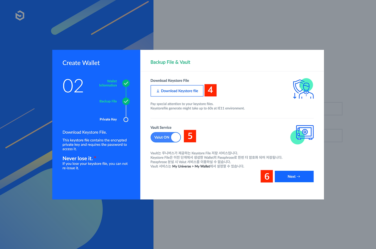 또한 Lunverse는 Vault라는 키스토어 파일 분실을 대비해 안전하게 저장해주는 서비스를 제공하고있습니다.(이부분은 추후 자세히 설명할 예정입니다.)