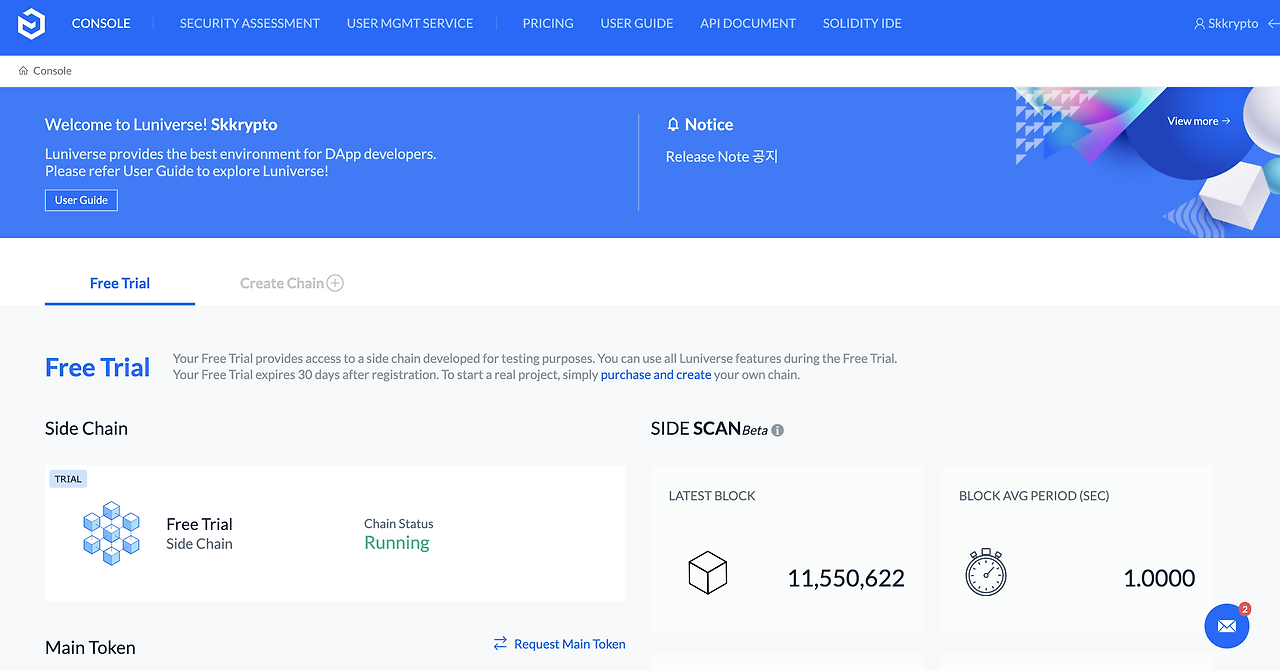 즉 루니버스는 타 블록체인과 다르게 서비스 운영자가 보다 쉽게 블록체인 서비스를 운영할 수 있는 환경을 제공한다는 차별점이 있습니다. 실제로 가입 후 Console 창을 보면 웹상으로 구현되어 있어서 문과생에서 공포의 존재인 Terminal에서 명령어를 통해 제어하거나 별도의 Front page를 만들 필요가 없습니다. 단순히 회원가입만 하면 됩니다!!