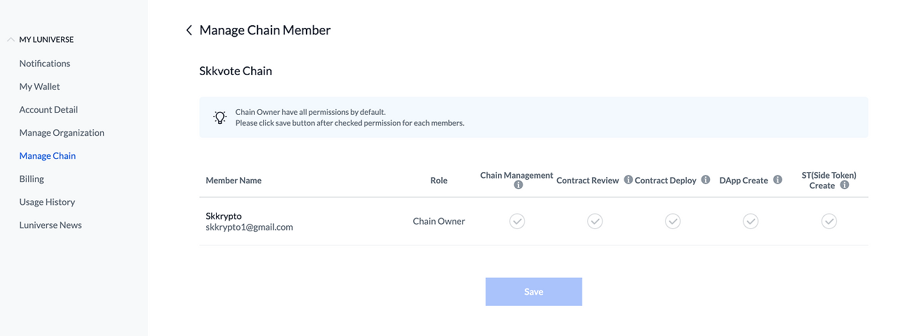 이제 validator의 권한을 설정해야합니다. 기본적으로 chain owner는 모든 권한을 가지고 있으며