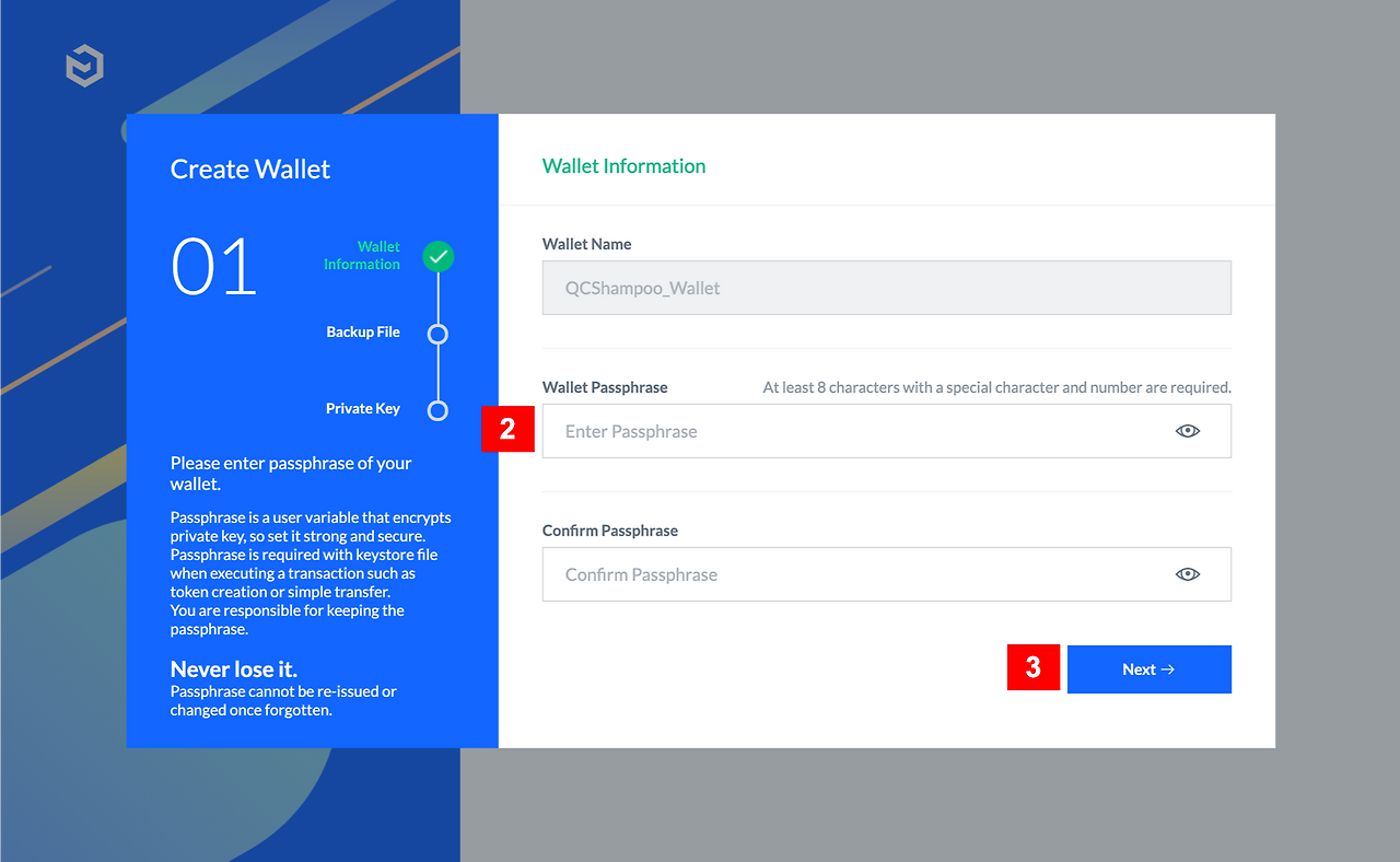 패스프레이즈(Passphrase)는 변경할 수 없으며 패스프레이즈(Passphrase) 를 분실한 경우에는 키스토어(Keystore) 파일이 있더라도 트랜젝션 사인이 불가합니다.