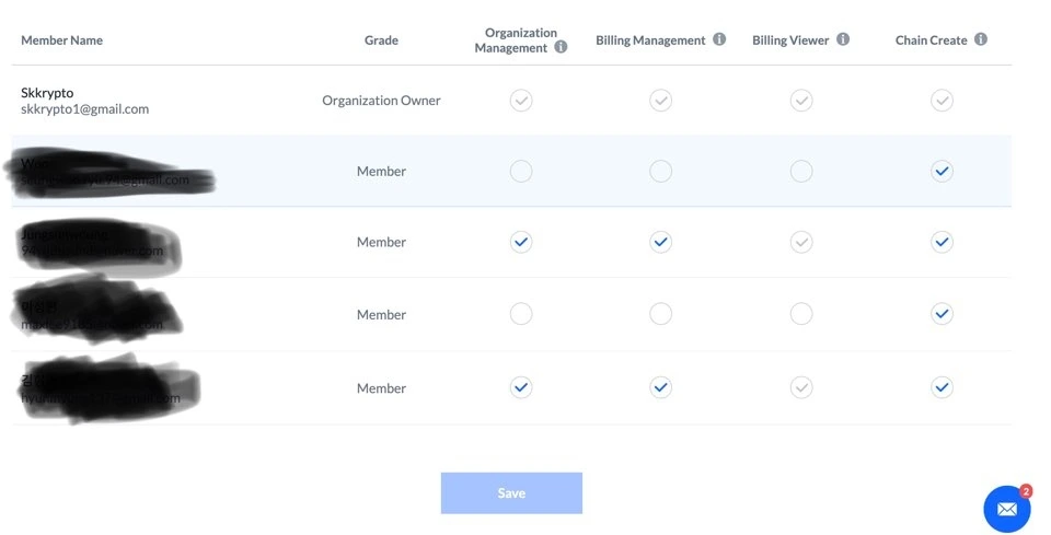 저희는 두개의 프로잭트 그룹이 있고, 기존 기수 2명은 회장과 총무기 때문에 모든 권한을 부여했고, 신입기수 분들은 chain create 기능만 부여했습니다.