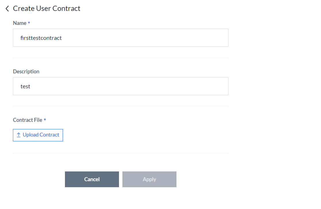 다음과 같이 3-20자 이내의 영문/숫자로 이루어진 이름과 설명 그리고 Contract File을 업로드 할 수 있습니다. 미리 만들어두신 Contract File이 있다면 업로드 하신 다음 Apply버튼을 누르면 완료됩니다!!