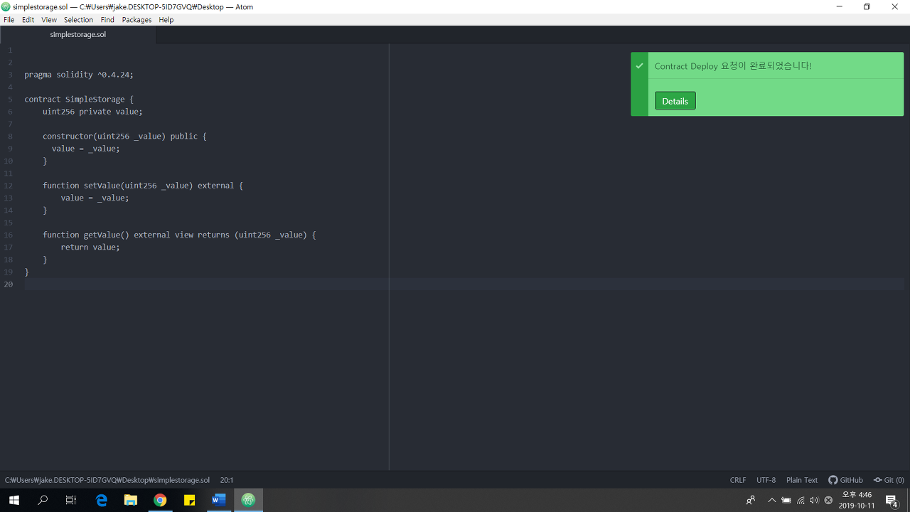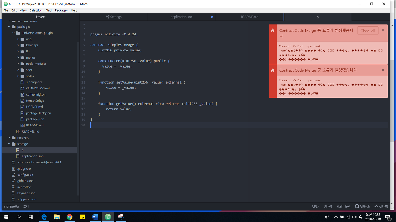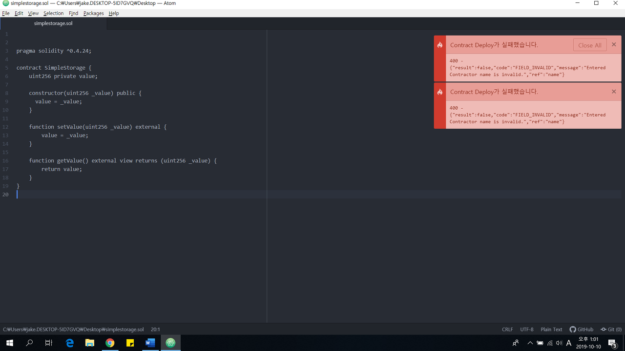 유저 가이드에 나와있는 코드를 작성하여 compile 하면 이제 배포가 완료되는데요. 저의 첫 번째 어려움은 여기서 시작되었습니다. 위 예시에는 simplestorage.sol이라는 파일이 존재하는데 제 atom는 보이지 않아서 새로 만들어야 하는건지 만든다면 어떻게 만들어야 하는지 위 사진처럼 오류가 떠서 꽤 난항을 겪었습니다.