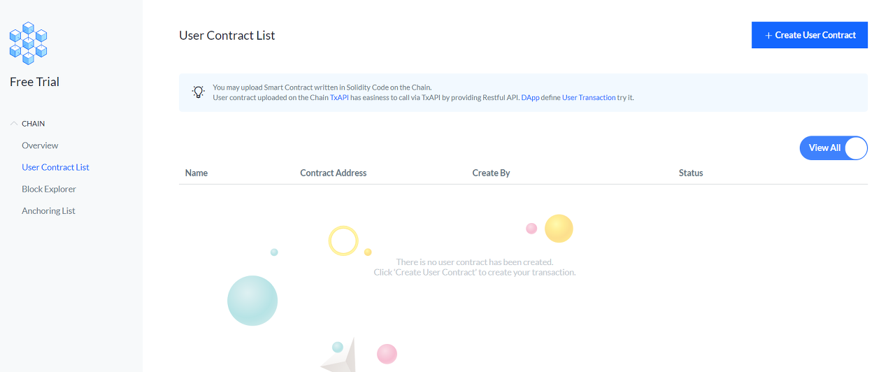 루니버스에서는 GUI(graphical user interface)를 통해 간단한 클릭 몇 번으로 사이드 체인에 스마트 컨트랙트를 배포하여 블록체인 트랜잭션 발생시킬 수 있습니다.