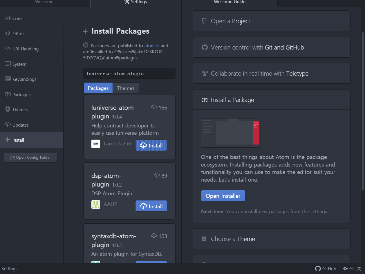 2) Install packages창에서 Luniverse-atom-plugin을 설치