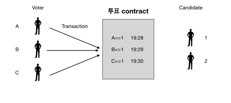 간단한 예시를 통해 블록체인이 완벽하게 익명성을 보장해주지 못하는 이유를 설명해보겠습니다. 블록체인은 트랜잭션 순서대로 데이터를 저장합니다. 투표자 A,B,C와 후보 1,2가 있다고 가정해보겠습니다.