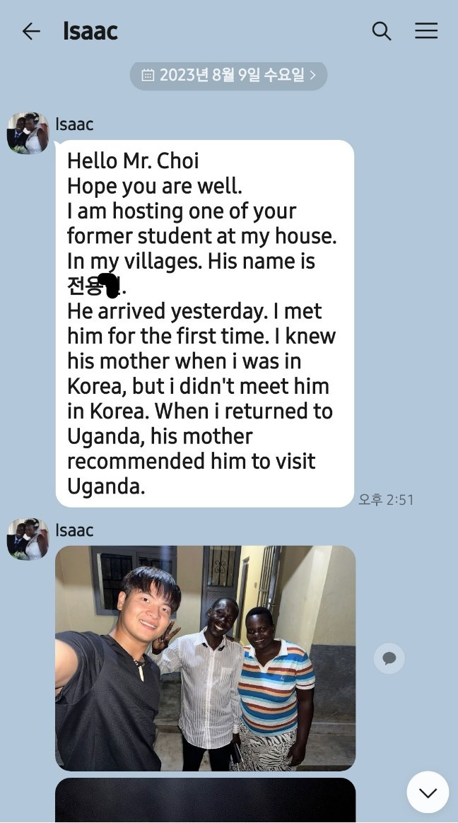 그것이 인연이 되어 시골 장터까지 아이작 부부도 태워주었고, 아이작이 석사과정 졸업식하던 날은 지인과 함께 가서 축하금도 전해 주었습니다. 아이작 부부 결혼 기념일엔 지인과 함께 제 차로 경남 시골 마을까지 드라이브도 하고 선물도 꽃다발까지 전하며 축하해 주었습니다. 물론 얼마 안 되는 축하금도요. 유학생들이 공부 기간이 끝나면 그들끼리 저를 인수 인계하더군요. 아이작과는 그렇게 한 7년 인연이 되었습니다. 금년 3월 아이작이 우간다로 돌아갔습니다. 3년 전에 아이작과 대화를 하다가 자신의 고향 마을에 학교를 다니지 못하는 아이들이 많다고 하기에 제가 뭘 도와줄까 했더니 문구 세트를 부탁한다고 하더군요. 그래서 그러면 아이들 문구 세트를 사기 위해 돈이 필요할 테니 얼마나 줄까 했지요. 그래서 당시 300달러를 주고 확인 영수증을 받았습니다. 애초에 받을 생각이 없었으니 영수증은 필요도 없었지요. 확실하지는 않지만 한화로 약 36만원 정도 되었습니다.