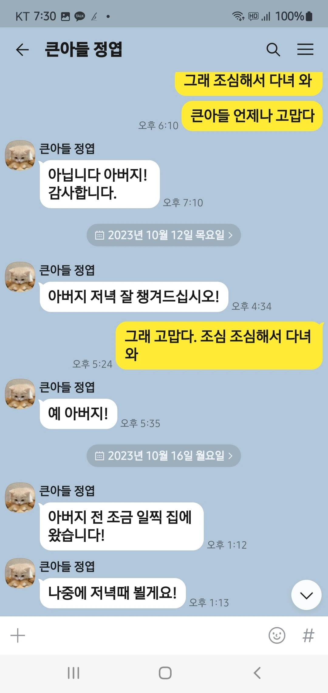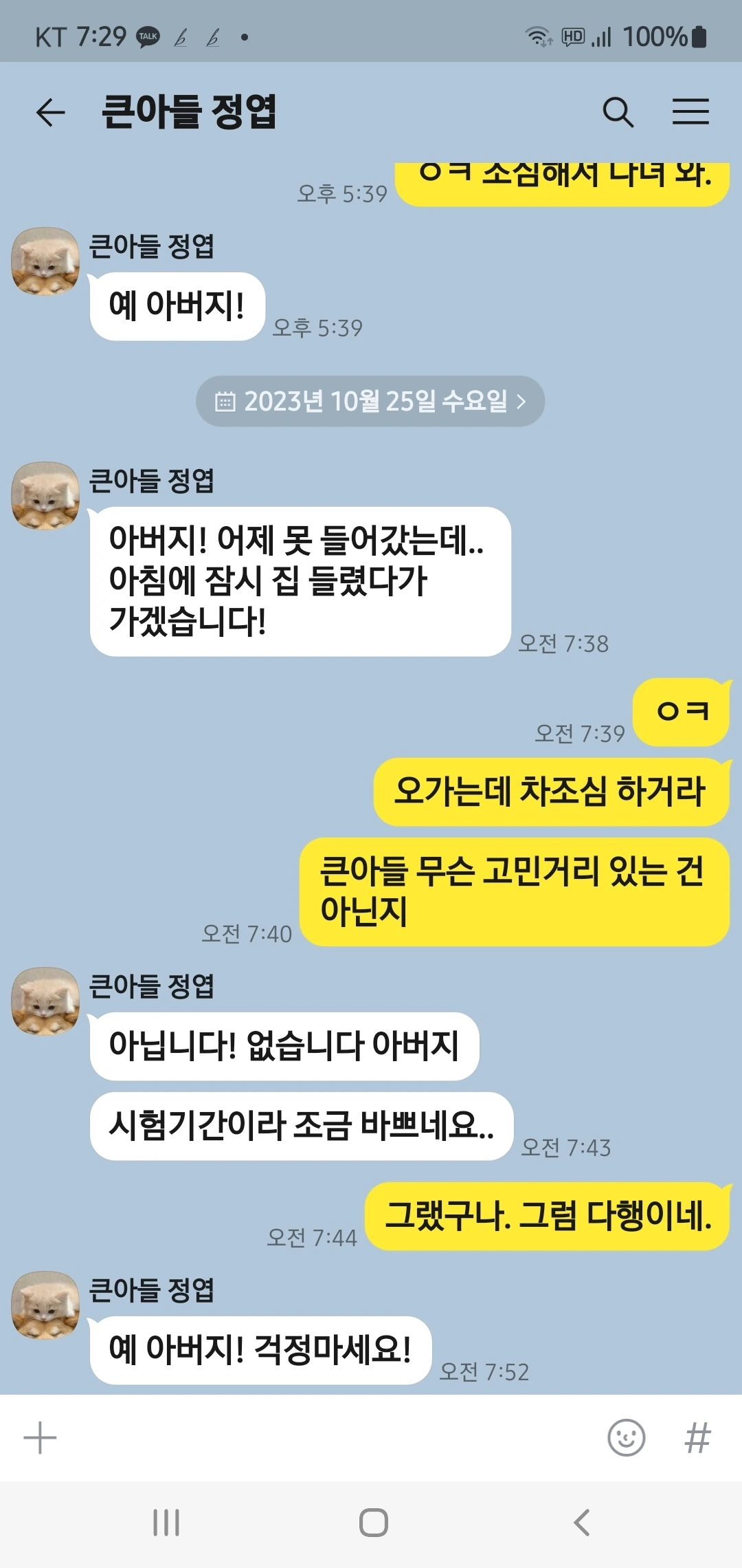 어제는 저에게 큰아들을 진지하게 앉혀 놓고 요즘 어떻게 생활하는지 한번 물어 봐달라고 요청합니다. 그래서 제가 알았다고 답하는데, 갑자기 현관문에서 초인종이 울립니다. 큰아들이 오랜만에 며칠 만에 들어옵니다. 환하게 인사를 합니다. 제 마음이 환해집니다. 무슨 일 없느냐고 물었더니 전혀 없답니다. 그리고 제가 한 마디 했습니다.
