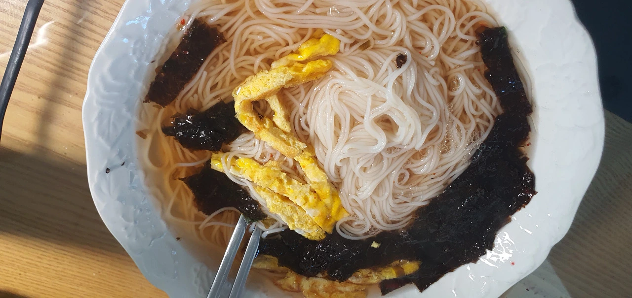 "나도 국수 먹을 끼다. 맛있게 먹을 끼다."