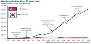 한국의 경제 성장은 단기간에 폭발적으로 크게 성장하는 방향으로 진행되었으며, 짧은 기간에 산업화와 민주주화도 동시에 이뤄낸 몇 안되는 국가 중 하나다. 1961년(5.16 군사정변) 기준으로 한국은 106개국 중 91위, 1972년(10월 유신)에는 130개국 중 81위, 1979년(10.26 사태)에는 137개국 중 64위, 1987년(6월 항쟁)에는 164개국 중 54위, 1996년(OECD 가입)에는 192개국 중 43위, 2002년(선진국 진입)에는 199개국 중 45위, 2012년에는 177개국 중 30위로 올랐다는 것을 확인할 수 있다.