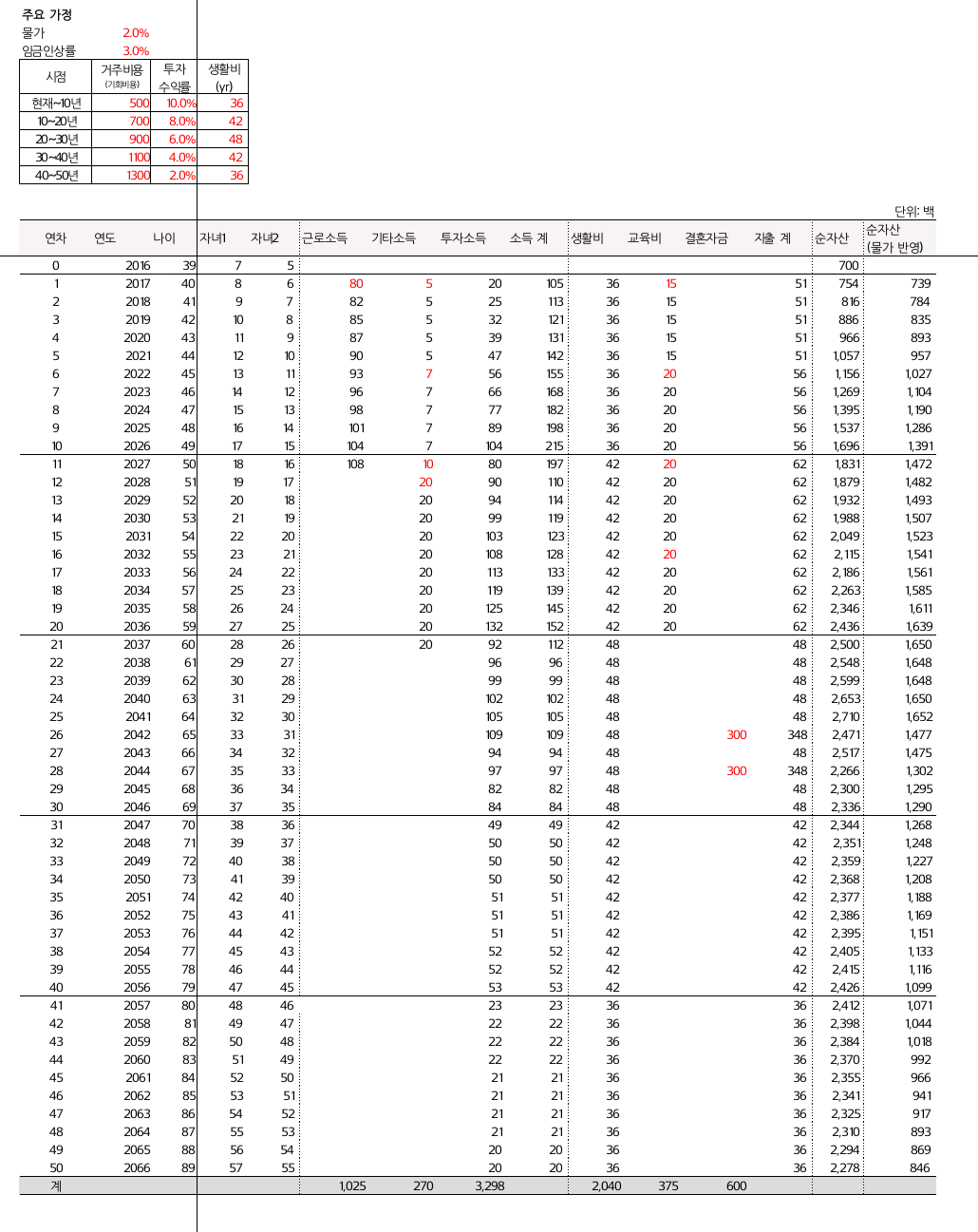 이렇게 적은 후 전년도 순자산에서 소득을 더해주고 지출을 빼주면 나이별로 순자산이 계산됩니다.