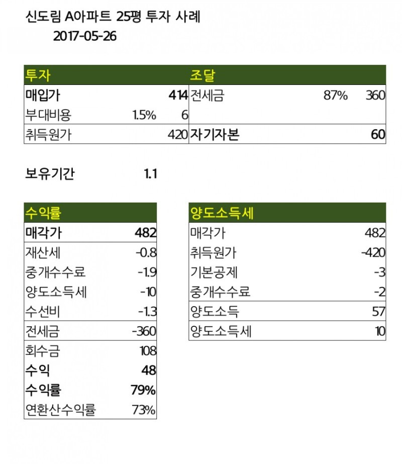 414백만원에 매수하여 482백만원에 매도하였습니다.가격이 13개월만에 16%가 올랐습니다. (개인 정보 보호를 위해 실제 매각한 금액은 482백만원과 조금 차이가 있음을 알려드립니다.)