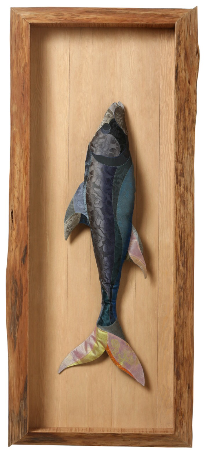 광장시장 원단 가게의 바닥부터 천장까지 빈틈없이 쌓아놓은 비단들 속, 오랫동안 켜켜이 쌓여 있었던 바람에 조명에 노출된 한쪽 면이 빛에 연하게 바래버린 공단 두필을 갖게 되었었다. 바로 그 부분, 빛 때문에 색이 바래 오히려 빛처럼 하얗게 빛나는 그 부분을 잘라 물고기 몸통을 삼았다. 조각보라고 보이지는 않겠지만 조각보 만드는 기법으로 바느질해 만든 나의 첫 번째 물고기.