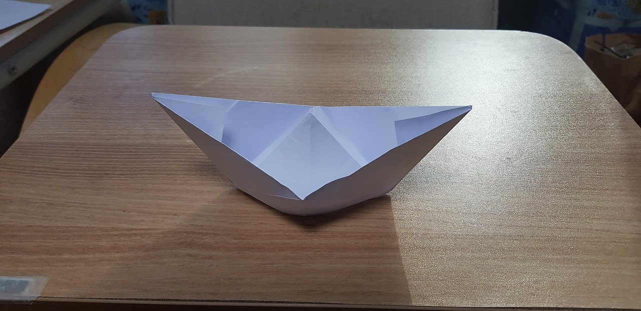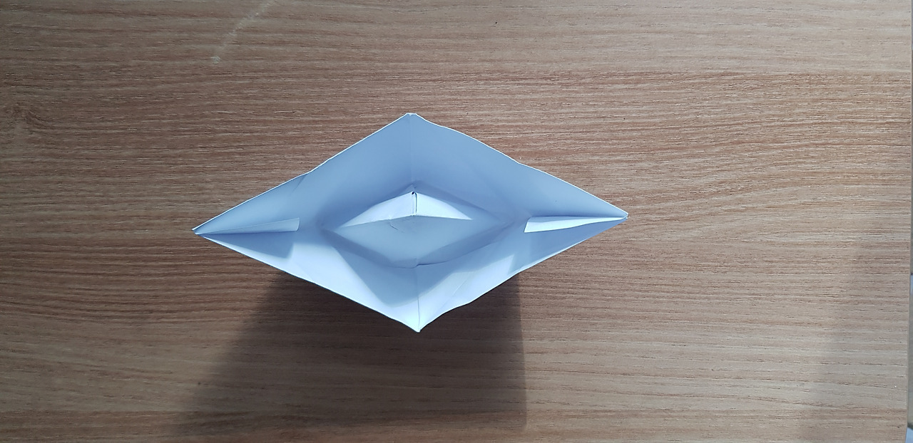21. 뾰족탑이 몸 쪽으로 향하게 수직으로 양손으로 들고, 양손 중지와 약지를 반대 편 구멍에 넣어서 양쪽으로 살살 벌리면서 배 모양을 만들면 종이배 완성.