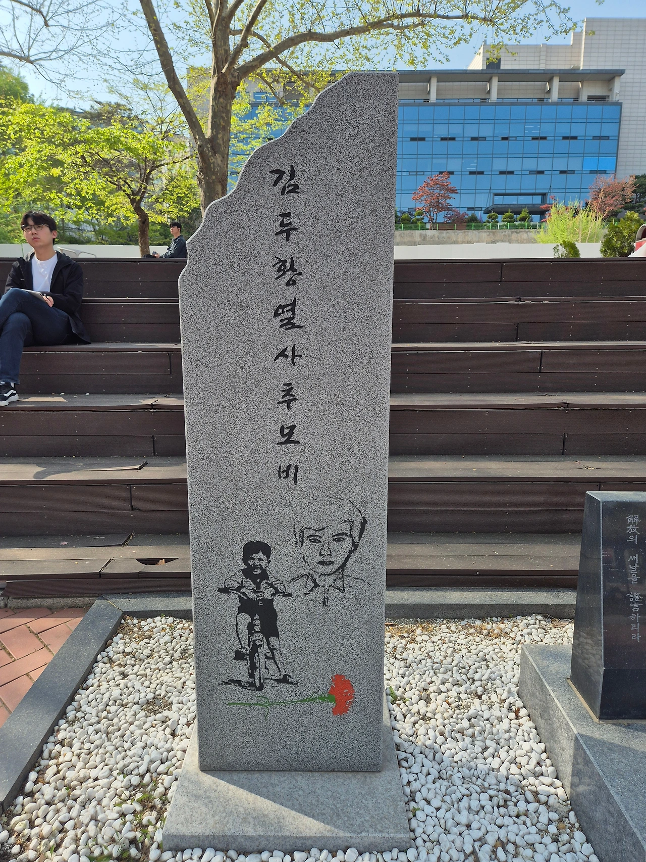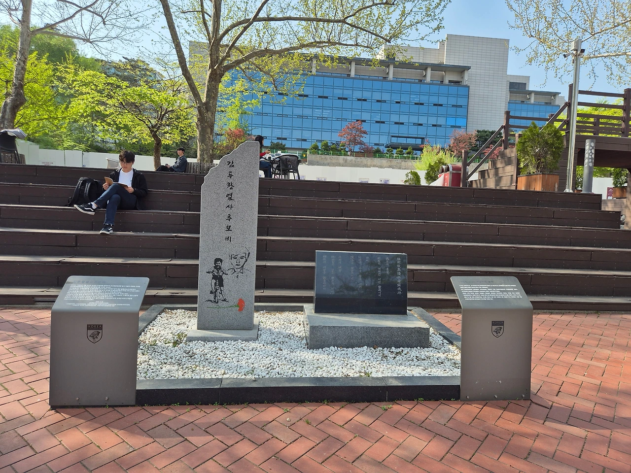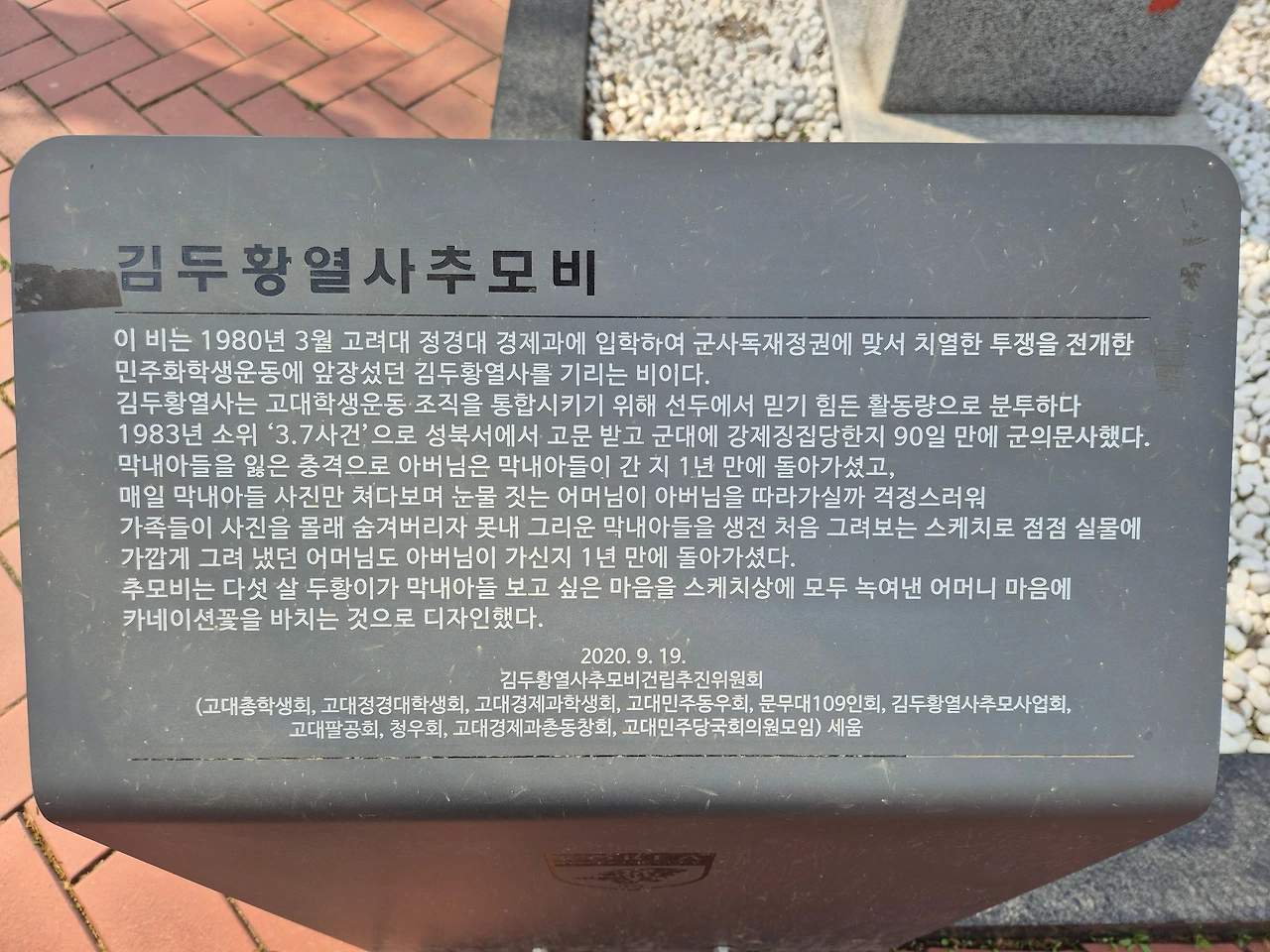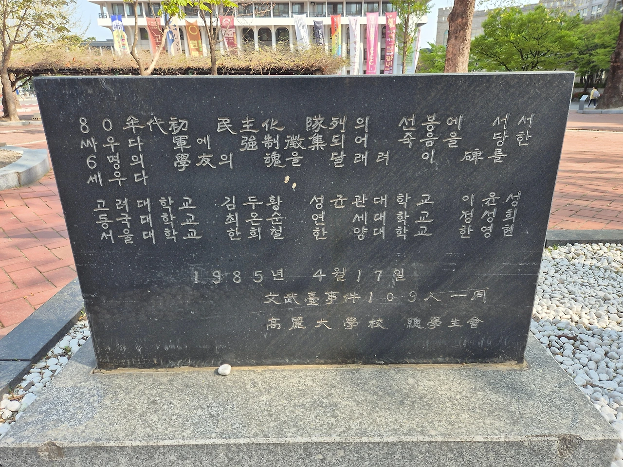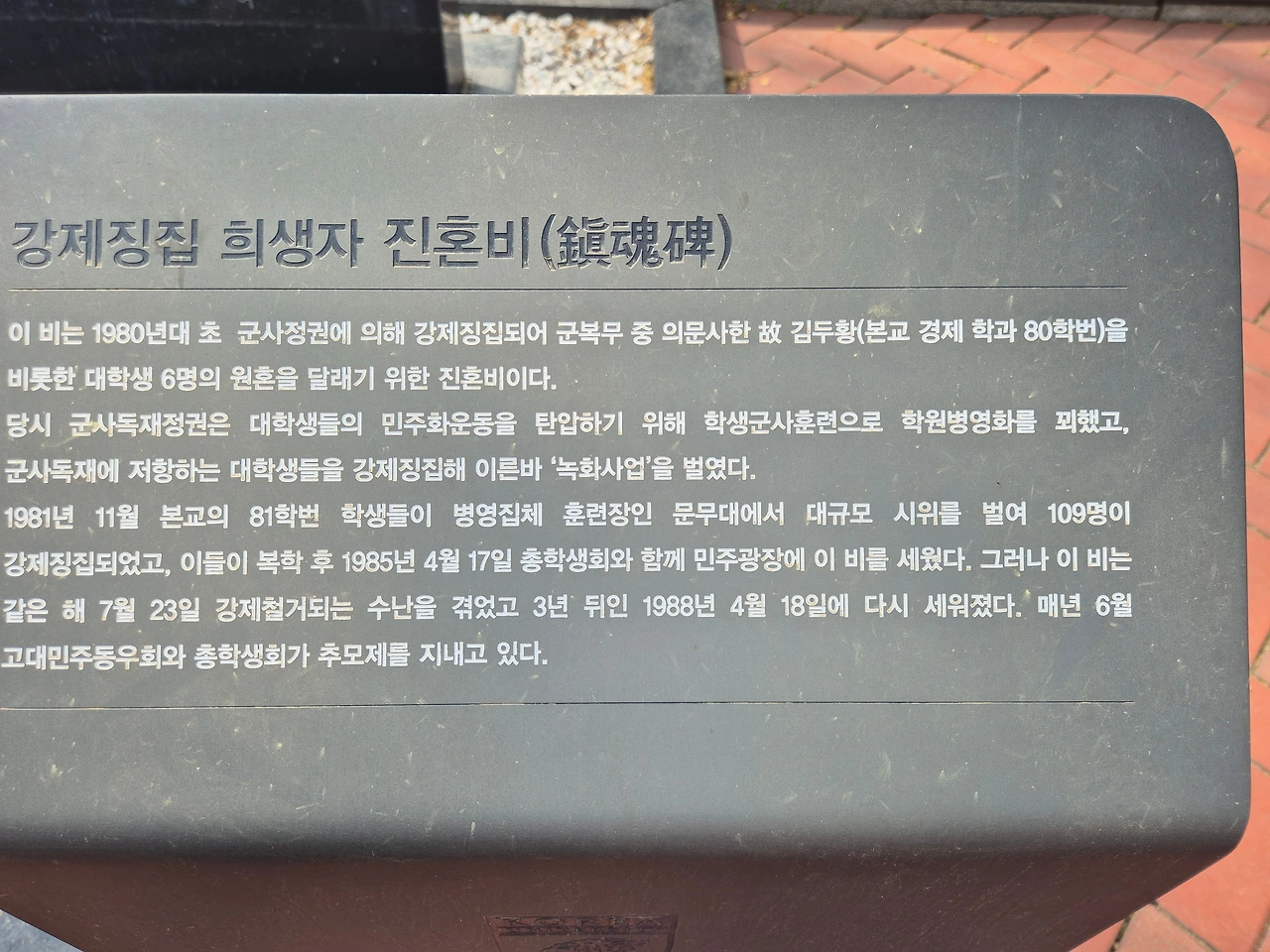 1985년. 군에 강집 되었다 전역한 109인 복학생은 6인의 혼을 위로하려 비를 세우다. 김두황 열사 추모비와 강제 징집 희생자 진혼비. 고려대학교 학생회관 앞 민주광장.