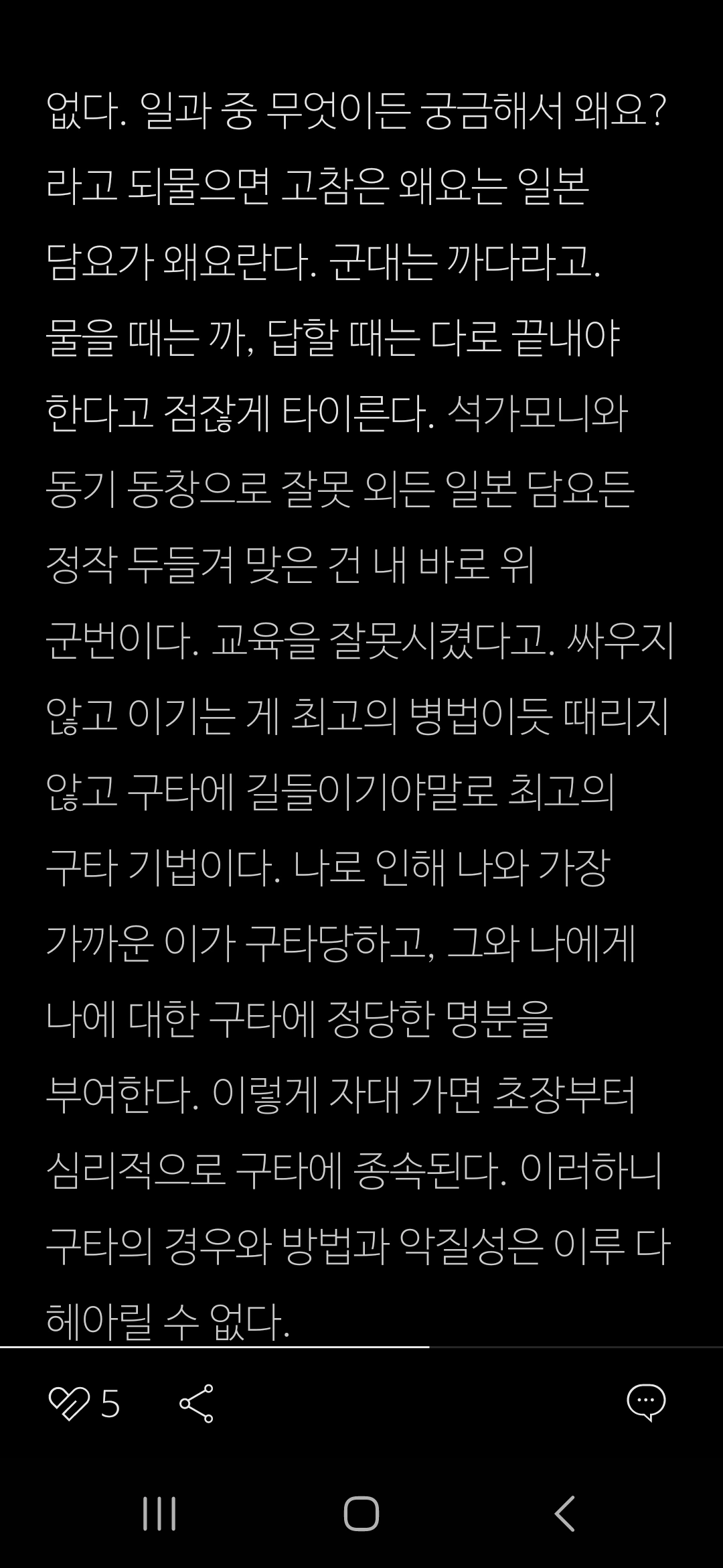 유일한 생명선인 병참 도로 제설 작업 중 휴식. 다들 길가 아무데나 아무렇게나 널부러져 땀을 식힌다. 순시 돌던 대대장 짚차를 보고 조 병장이 내게 던진 말이었다. 그에게는 대대장 중령은 이룰 수 없는 꿈이었던 거. 그는 소대 왕고참이다. 중졸. 키는 제일 작아 160에 모자라다. 면도 볼품 없어 수호지의 찌질이 무대보다 조금 나을 정도. 대학 1년 마치고 갓 훈련소를 마친 막내는 175에 건장한데다 한 인물하여 경양강 숲에서 호랑이 맨손으로 때려잡은 무송급. 무대는 무송이 귀엽다며 강아지처럼 데리고 다닌다. 잘 때도 옆에 재운다. 손을 내복 하의에 찔러넣어 거시기 만지작. 뿌리치지 못 한다. 신병교육대 5주 내내 날마다 매시간 매분 이보다 더한 능욕을 당했고, 거부 즉 항명이다. 정당 부당 이런 건 애초에 없어서 무자비한 구타에 이미 길들여졌다. 나는야 개ㅅㄲ. 아니 그만도 못한 버러지. 그렇지 않은가. 미친 개도 몽둥이 찜질이지 성기를 희롱하진 않는다. 게이는 아니어서 그 이상 않는 걸 다행으로 여길 뿐.