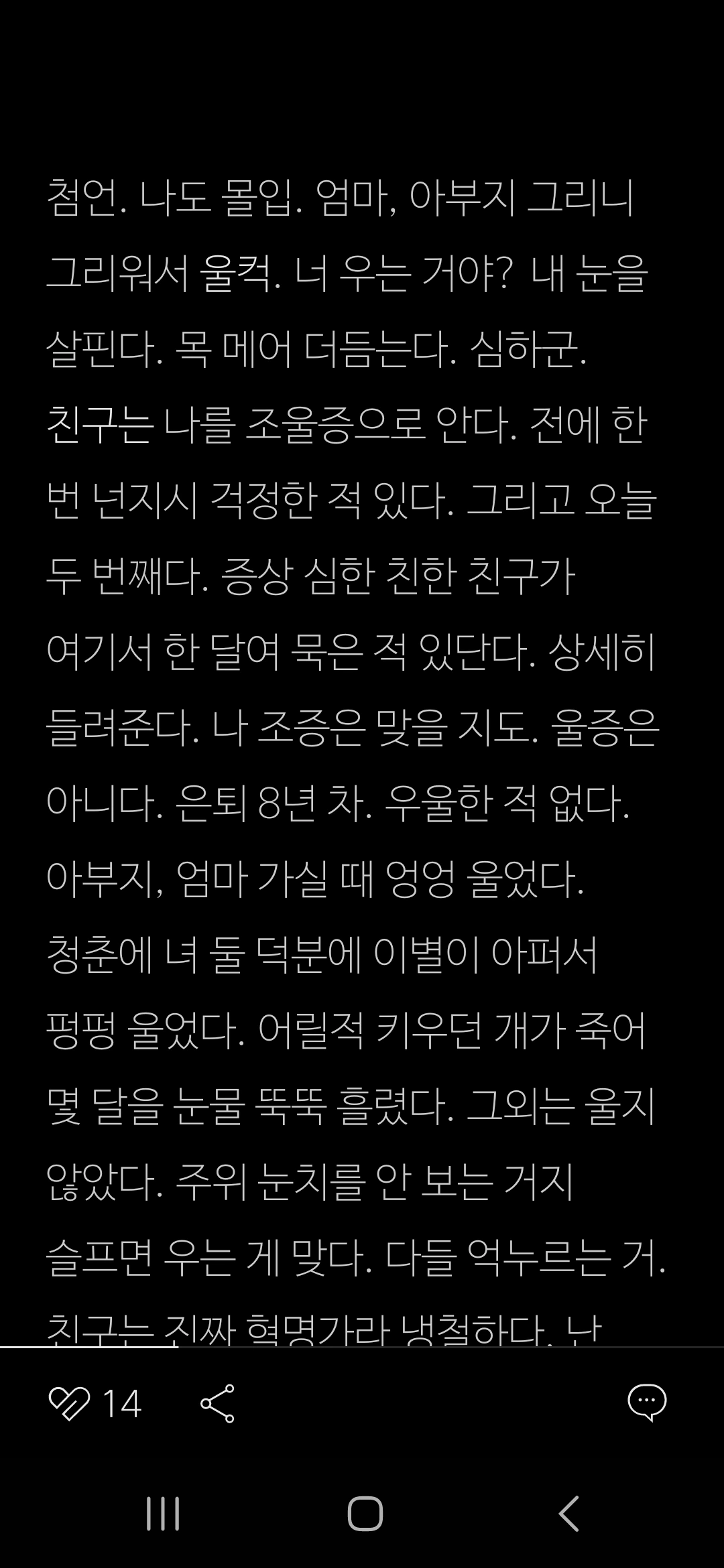 40여 년만에 만난 운명의 친구 셋. 올해 세 번 만났다. 단톡방부터 만들어 키톡. 첫, 두 번째 만남서 나를 조울증 의심. 그 질환 안다. 조울증은 기분이 업 앤 다운. 주기를 두고 반복한다. 주기는 며칠, 몇 달일 수도. 세 번째 만남서 심하다고. 글을 보고. 약한 조증. 울증은 아니라고.