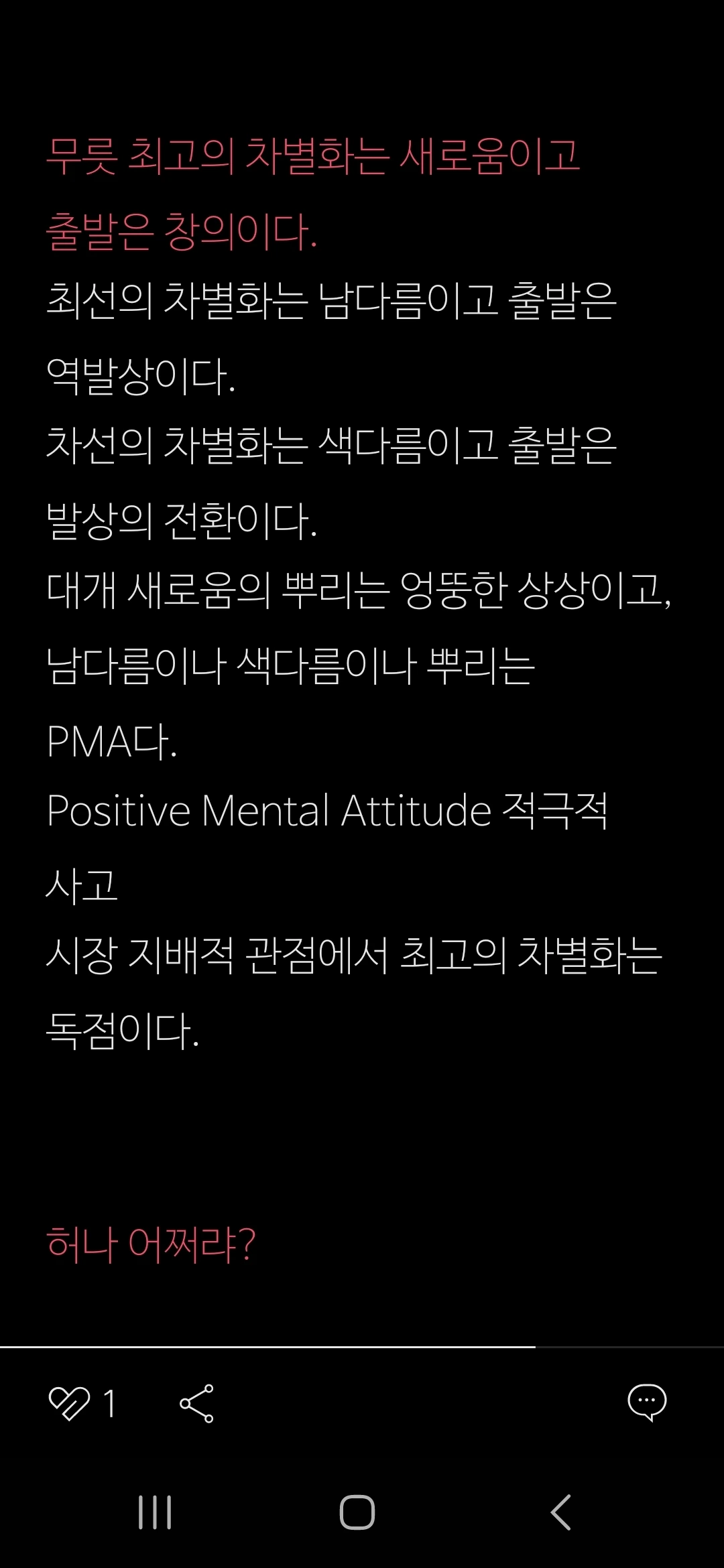 평생 금과옥조. 위기는 기회다. 늦빠. 늦었을 때가 빠른 때. 두 자로 외고 다녀. 잊을까봐. 바로 꺼내서 써먹으려고. 안이될방. 안 되는 이유보다 될 수 있는 방안을 찾자. 장강단보. 장점은 강화 단점은 보완. 마찬가지 넉 자 성어로. 이 넷을 합쳐서 PMA. Positive Mental Attititude. 적극적 사고. 그리고하나 더 차별화. 경쟁에서 최고의 가치.돈 되려면 차별화 필수.돈 아니어도 원리는 같아.