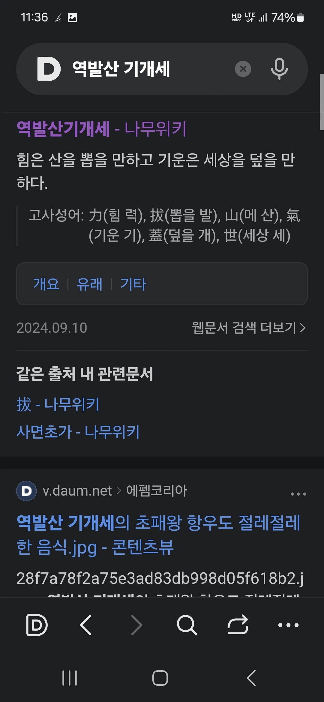 힘은 산을 뽑을만 하고 기운은 세상을 덮을 만하다. 고사성어.