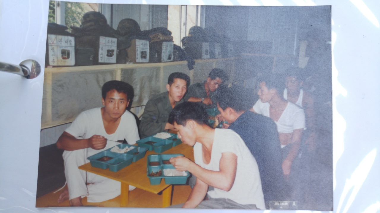앞에서부터 김 병장, 강 병장, 세 번째 군복 입고 사진기를 바라보는 이가 주인공