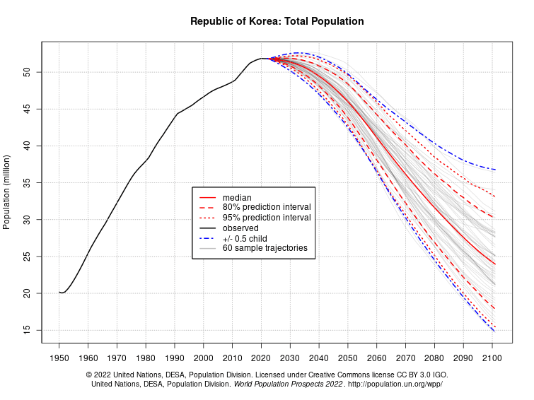 한국, 서울 출산율은 대체출산율과 차이만큼 인구가 줄어든다.