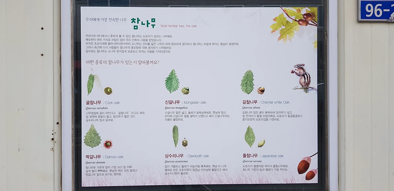 참나무 종류가 엄청 궁금하던 차에 때마침 벽에 붙은 걸 보고 한 자 한 자 옮겨 적은