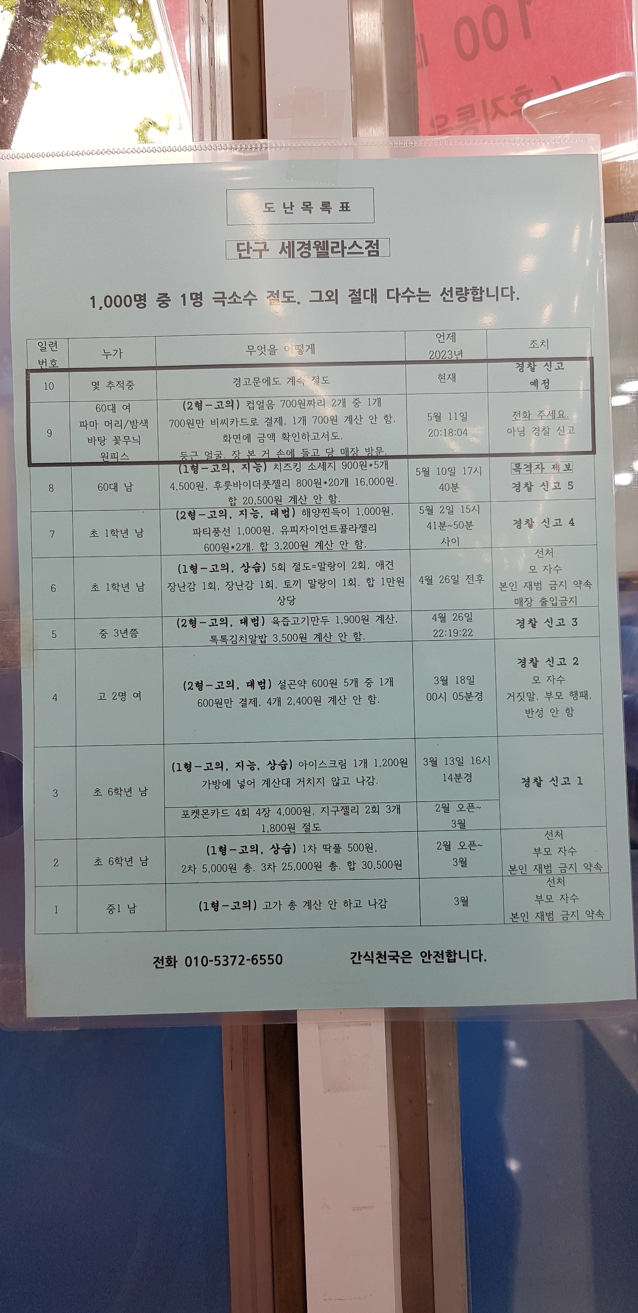 모 자수. 면담. 천 원, 이천 원 장난감만 5회 절도. 먹거리 손 안 댄 거로 보아 배 고픈 건 아냐. 2차 면담 할머니 등장. 어릴 때 그럴 수도 있지 않냐며 물건값만 만 원 내겠다고. 당당하다. 불쉿! 애 엄마는 입 꾹 다물라 미리 단도리하고 싸게 쇼부칠라고 작정하고 나선 거. 딱 보니 할매가 애 망친 거. 가세요. 쫒아와 매장 안에서 팔 붙들며 얼마면 되냔다. 당장 나가지 않으면 영업 방해로 경찰에 신고한다니까 허망한 표정으로 쫒겨나. 모가 문자. 정중히 잘못했다, 달라는대로 드리겠다, 감사하다. 최소 비용 5만 원. 훔쳐갔다는 거 1만, 면담 2회 빵집 베지밀 7병 값 1만, 면담 2시간 최저시급 2만, 횟수가 잦아 훔치고 기억 못 하는 거 1만.