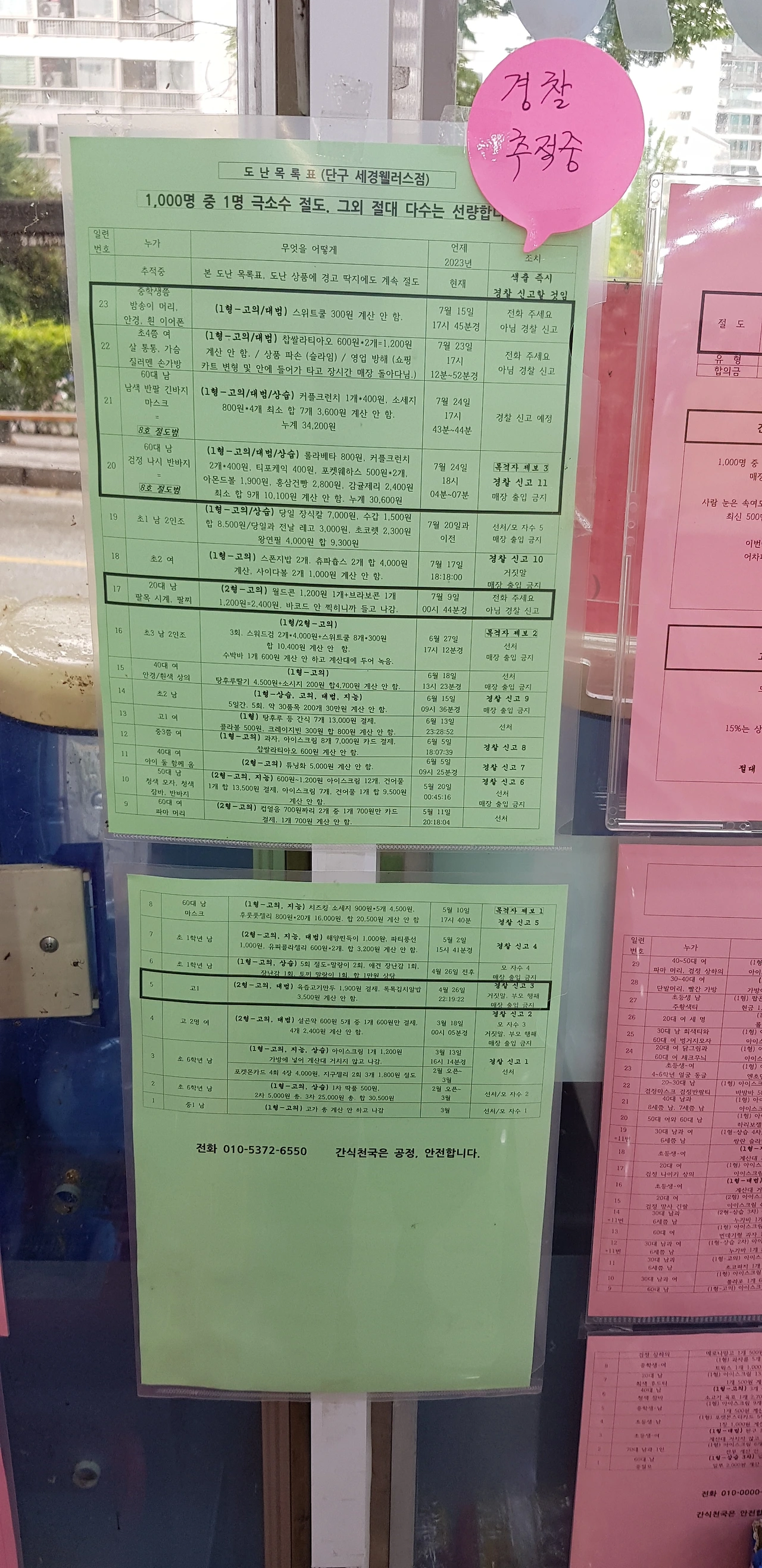 녀석들이 잡은 절도범 할배. 20호이자 8호 상습. CCTV 동일 시간대 추가 범행 훑다가 할배 한 건 더 적발. 이로써 최소 3회 상습. 범인, 시간 특정되면 일도 아니다. 게다가 잔챙이 절도 2명 덤으로 색출. 300원과 1,200원. 중딩ㆍ초딩이라 경찰 신고보다 범인ㆍ부모 찾기로. 녀석 둘 덕에 절도 총 5건 아주 손쉽게 잡아낸 거