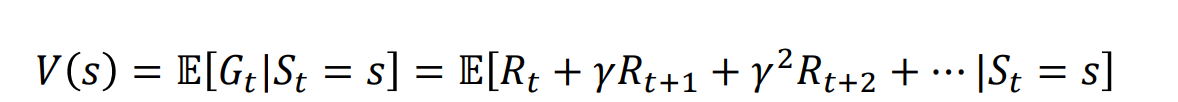 V(s) : the state s에서 시작되는 return의 기댓값이다. Bellman equation을 이용하면 바로 전 상태에 있던 값과 iterative한 계산이 가능하다. 아래식을 유도할 때, E(R_t + gamma*(R_t+1 + gamma * R_t+2...))을 유도하면 자연스럽게 아래 식처럼 유도가 된다.