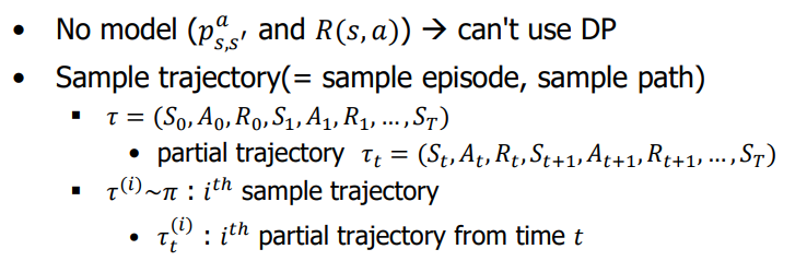 이제 알아야할 것들은 다 알았으니 Value based RL의 첫 번째 방법인 몬테카를로 방법을 알아보자. 강화학습을 해야하는 상황부터는 일반적으로 state transition probability와 reward model을 모른다. 그래서 우린 DP를 사용할 수 없다. sample trajectory를 통해서 state에 대한 value를 알아보고, 이를 이용해서 policy를 결정하고 다시 sample traejectory를 구할 것이다.