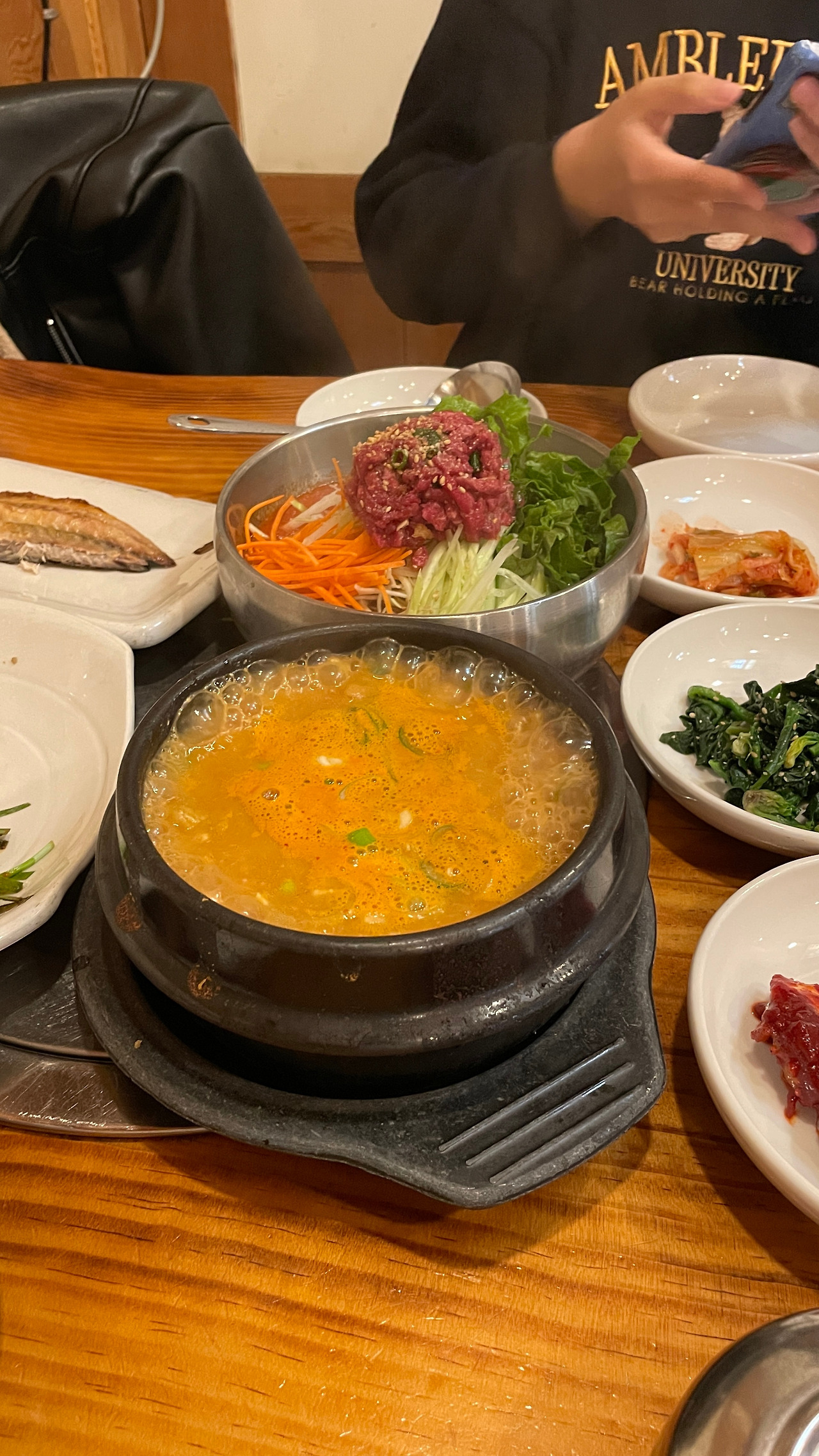 2. 그걸 먹는데 갑자기 여자친구가 부스럭거리면서 일어났다. 그래서 왜 그러냐고 하니까 자기가 꿈을 꿨는데, 내가 바람 피는 꿈이었다고 한다. 그러면서 내 가슴팍을 퍽 때렸다. 그리고 다시 잔다. 나는 이미 깼는데 자기는 개운한 표정으로 다시 잔다. 그래서 나는 공부할 것을 읽으면서 시간을 보냈다. 아이패드가 있으니 사실 심심하지는 않았다. 그렇게 우린 나갈 준비를 하고, 카페에 갔다. 카페에서는 여자친구는 수업을 들었어야 했고, 나는 어제 들은 과목 복습을 했다. 복습을 하고 나니 1시가 됐고, 우린 카페 근처에 있는 육회비빔밥 집을 가려고 했는데, 가려고 하는 길에 한식대첩4에서 몇개의 회차에서 우승한 분의 청국장집이 있던 것이다. 나는 사실 청국장보단 된장파이다. 차이는 그 콩이나 건더기가 나에겐 별로였다. 그래서 잘 안 먹는 편인데 생각보다 추운 날씨가 나를 청국장 집으로 이끌었다. 청국장 정식 두개에 한우물회를 시켰는데 정말 정말 맛있었다. 이보다 더 맛있는게 있을까 싶을정도로 청국장은 내가 먹어본 청국장 중 최고였고, 한우 물회는 한우 육회가 물회 형식으로 들어있는 것이었다.