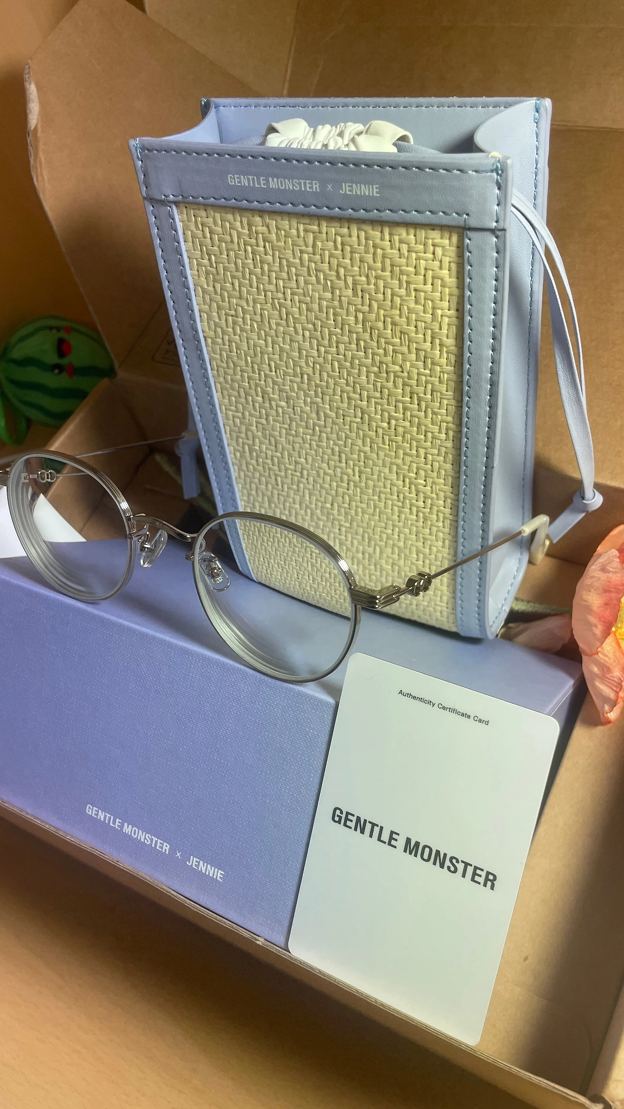 2. 여자친구가 안경을 택배로 받고 나서 처음으로 택배 사이즈에 대해서 놀랐다고 했다. 신발상자같은 사이즈가 왔다면서 신기해했다. 그래서 나도 이걸 처음 보는데 생각보다 엄청 커서 놀랐다. 내가 산것은 작은 안경인데 헬스인같은 보디가드들이 나를 둘러쌓은 느낌이었다. 젠틀몬스터가 처음이라 원래 이런 패키지인지 모르겠다. 이것저것 꺼내보니 꽃도 있고, 제니 패키지도 있고, 확실히 잘 모르는 내가 봐도 콜라보 상품같았다. 나는 은색 실테를 샀는데, 딴 것은 몰라도 내가 이걸 쓰면 내 자신이 너무 마음에 들었다. 시크한데 지적인 것 같다.