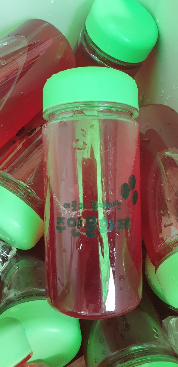 산책하면서 미션 장소에서 미션 두 가지를 하고 미션 도장을 찍고 오면 시원한 음료를 준비해 대접할 것이다. 음료 또한 일반 음료가 아닌 건강에 좋은 오미자청을 가지고 음료를 만들었다. 정성을 다해서 음료를 만들고 음료병 또한 다음에도 다시 재활용할 수 있는 물병을 주문 제작하여 오미자 음료를 150개를 만들어서 아이스박스 안에 얼음을 가득 담고 음료수를 시원하게 준비해 두었다.