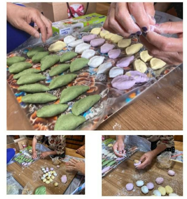 생활지원사님과 어르신들은 소수로 모여 굳은살이 붙은 손으로 떡을 빚싶니다. 예전에 늘 하셨던 일들이라서 손에서 척척 만들어져 나오는 알록달록 송편 우리는 따라갈 수 없는 솜씨입니다.
