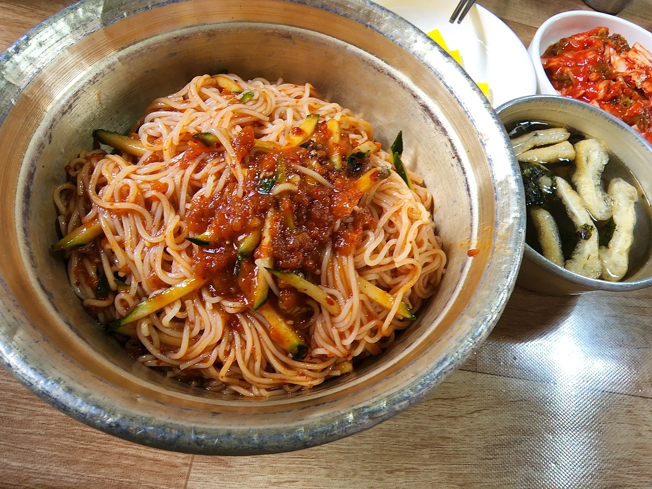 노란 양푼에 나오는 잔치국수와 비빔국수의 양에 놀랐다.