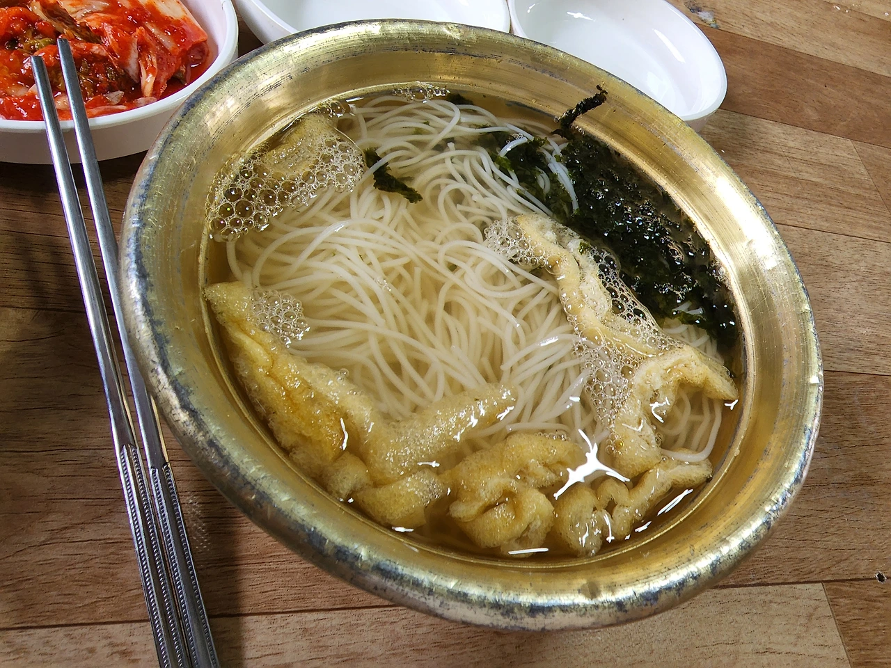 들어오는 쪽에서 계속 국수를 삶는 열기였다. 내부는 깔끔함과 거리가 먼 옛날 장터에서 팥죽 국수 팔던 모습이다. 그래도 나이 먹은 나는 한 번쯤 경험해 보는 광경이지만, 아이들은 익숙하지 않은 길게 늘어서 평상 같은 식탁에 등받이 없는 의자가 즐비하게 옆에 모르는 사람들과 낑겨서 먹어야 하는 불편함이 있었지만, 불평하지 않고 에어컨도 없고 더운 바람이 강풍으로 불어오는 선풍기의 바람을 맞으면 앉아서 기다렸다.