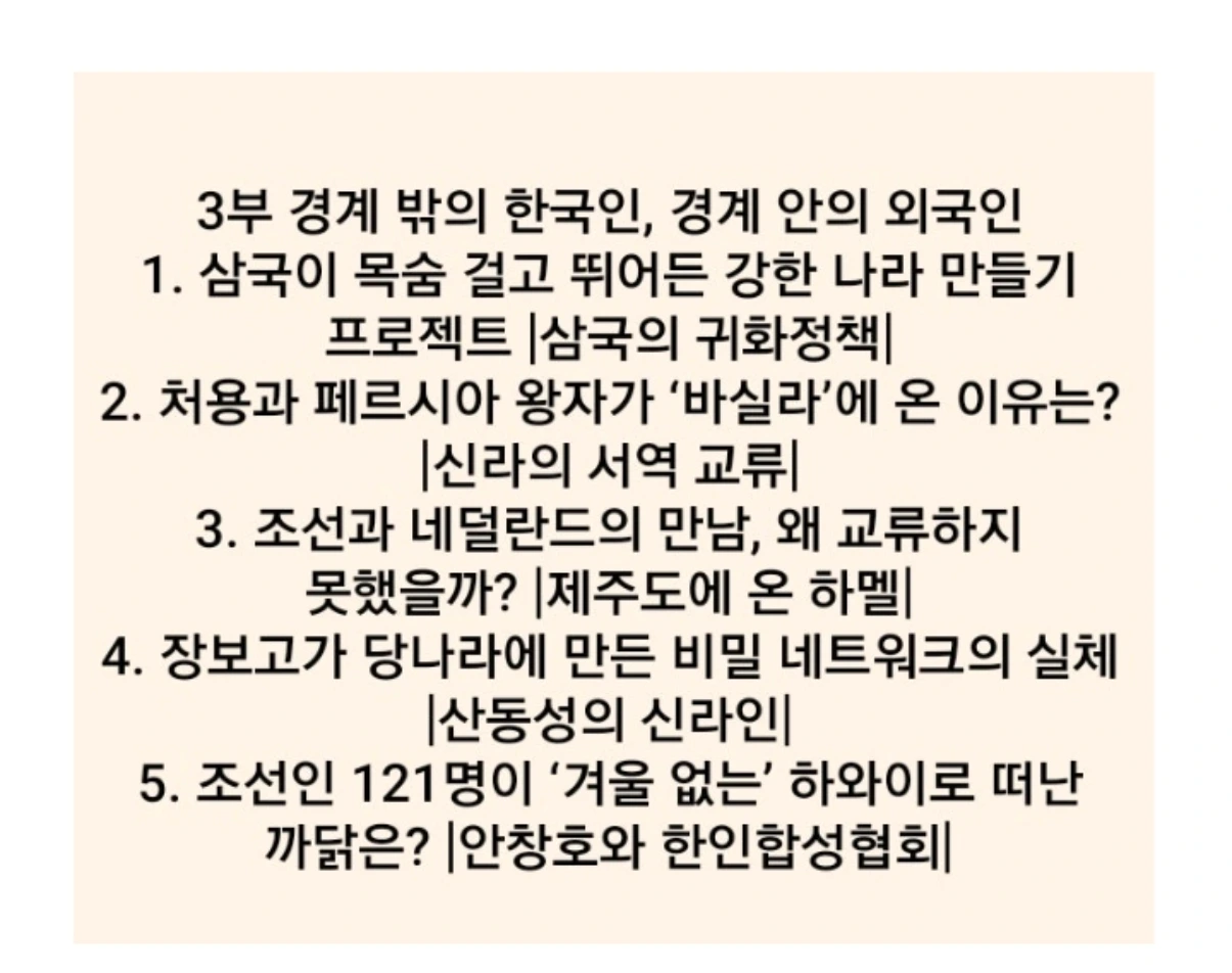 흔히 한국사를 한반도라는 좁은 틀 안에서만 생각하기 쉽지요. 하지만 이 책은 신라와 페르시아의 만남, 한국 독립운동을 도운 스코필드 박사의 활약 등, 국경을 넘나드는 이야기들을 통해 한국사의 시야를 넓게 확장시켜줍니다.