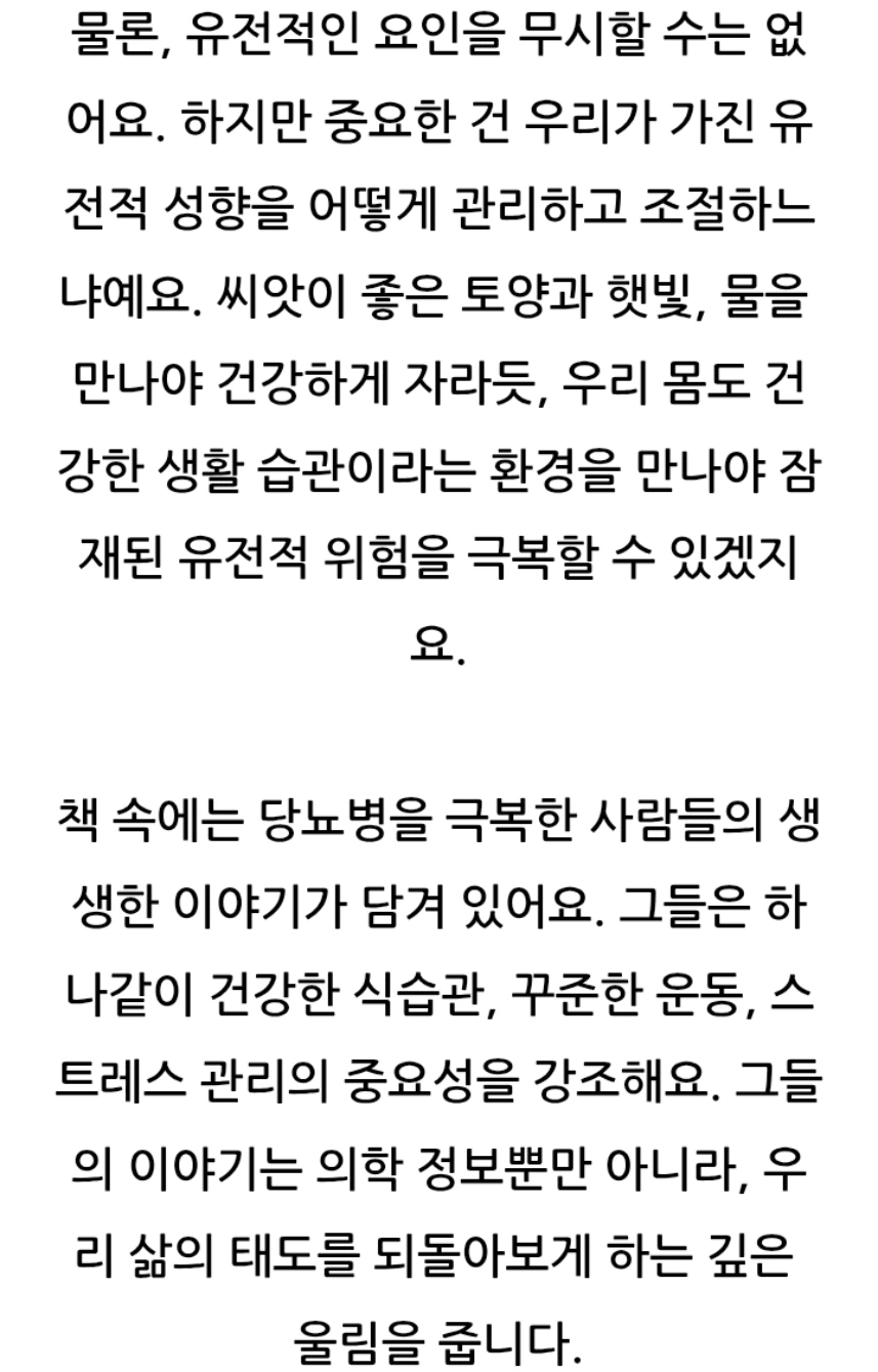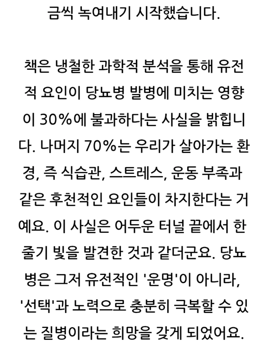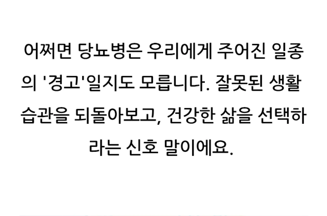 정기적인 건강검진과 혈당 체크는 물론, 건강한 식습관과 규칙적인 운동을 통해 우리 몸을 소중히 돌보는 것이 무엇보다 중요해요.