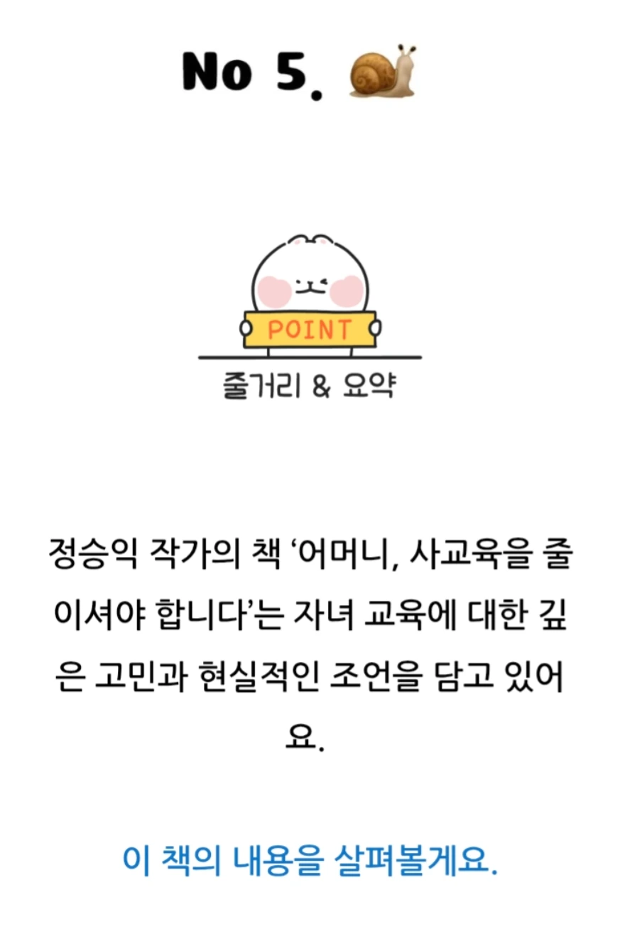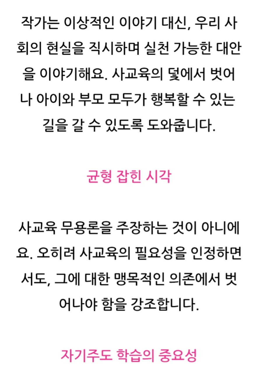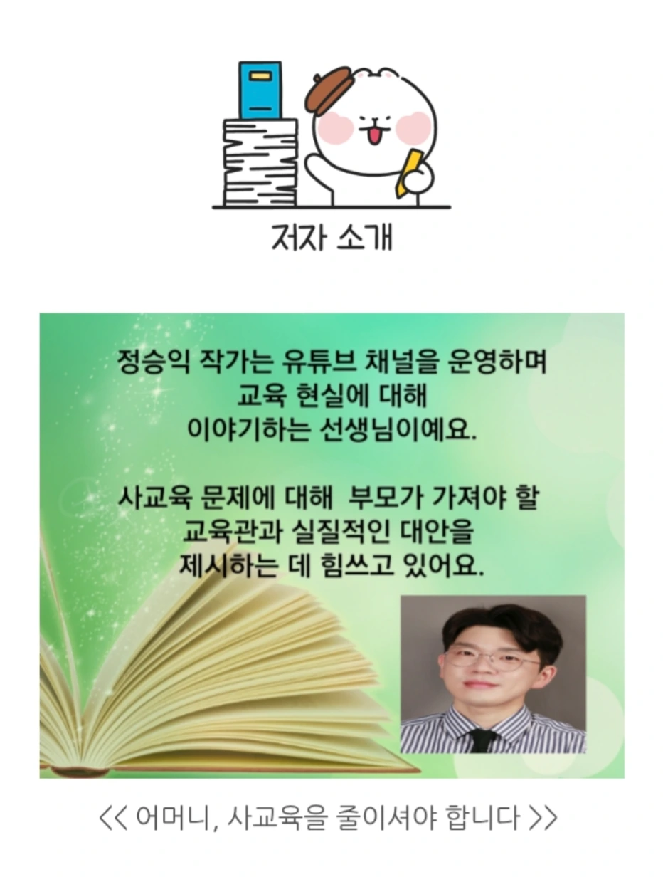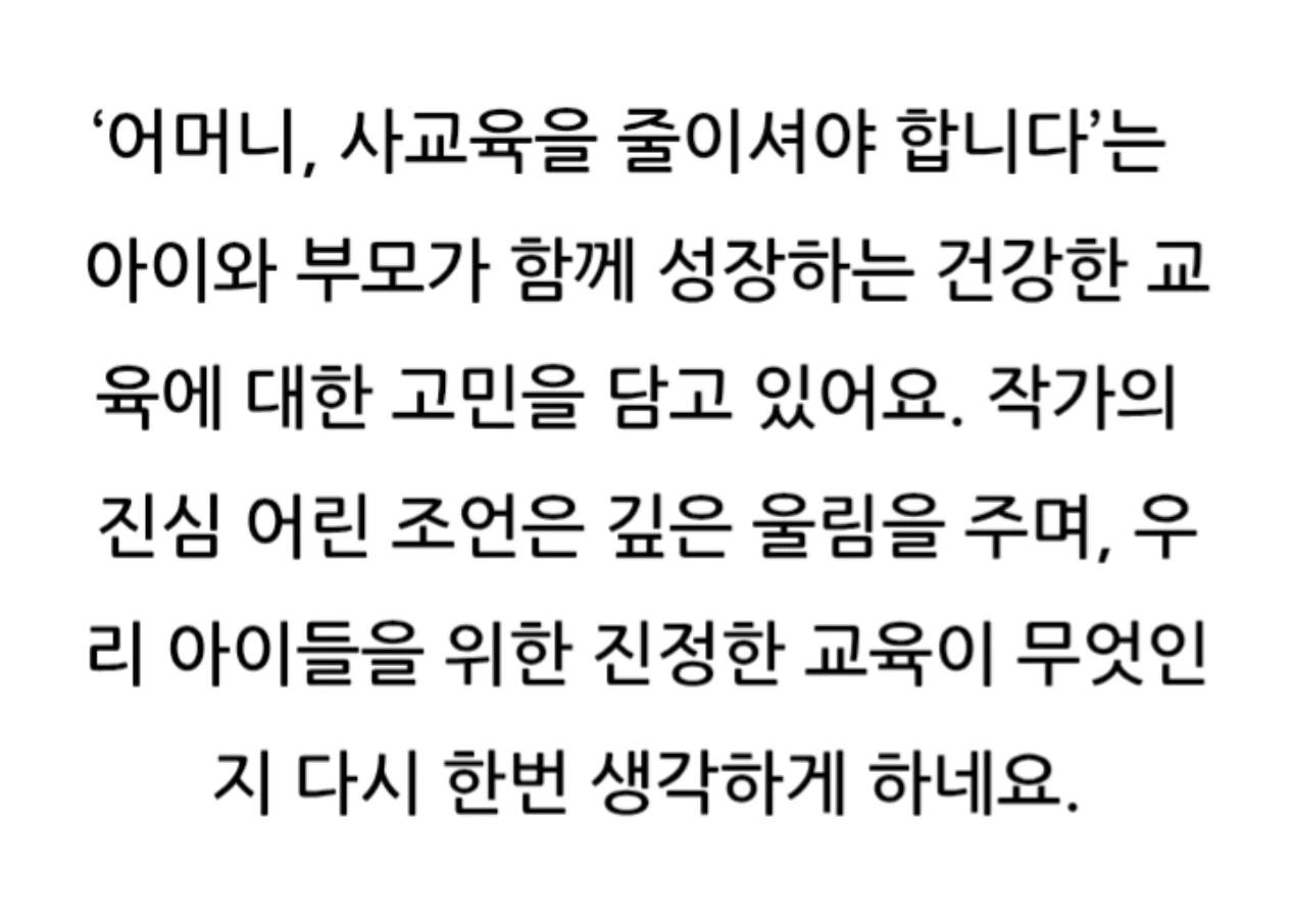 '어머니, 사교육을 줄이셔야 합니다'는 불안감과 막막함에 무작정 사교육을 시키기 전에 부모와 자녀가 할 수 있는 것들을 알려주는 책이에요.작가는 이 책을 통해 사교육 문제뿐만 아니라 궁극적으로 우리 아이들을 어떻게 잘 키울 수 있을지 고민하고 깊게 생각해 볼 수 있는 내용을 담았어요.