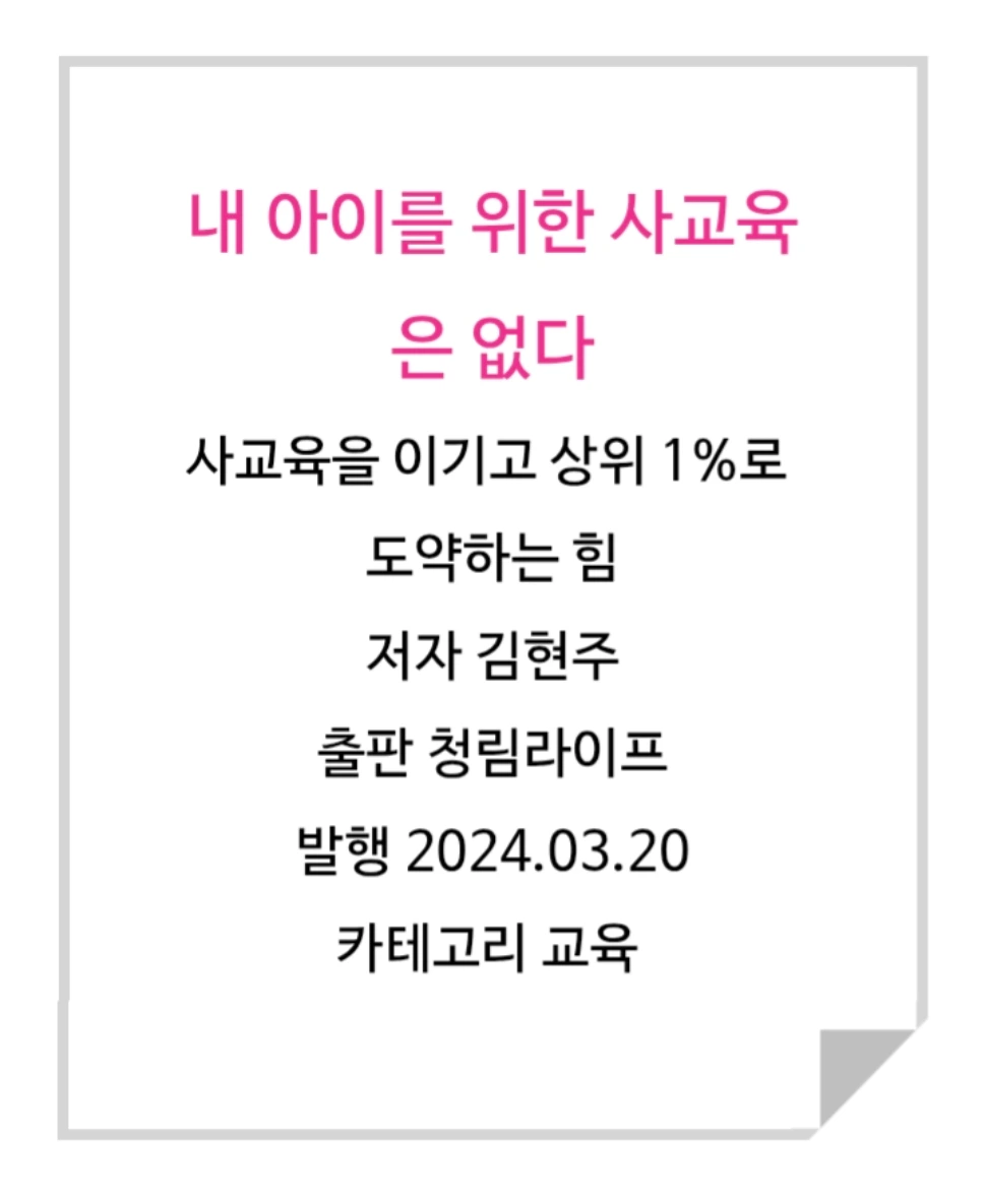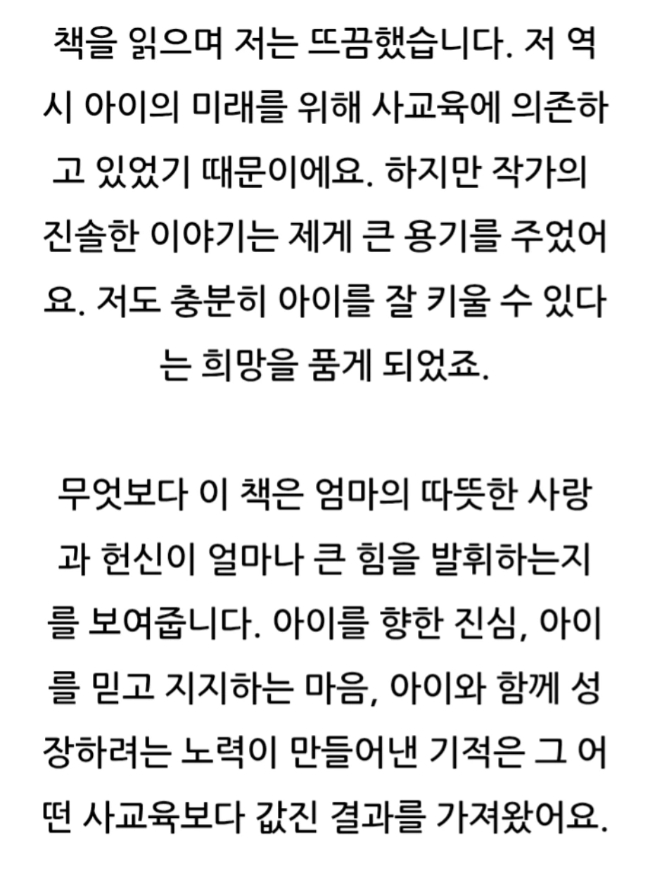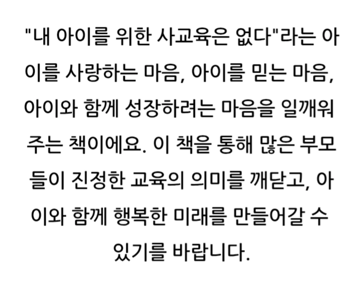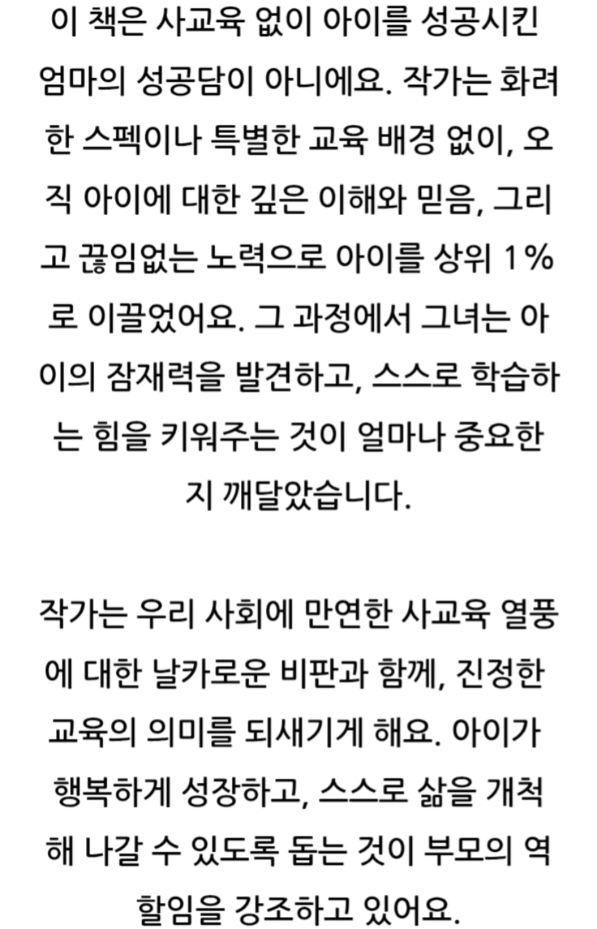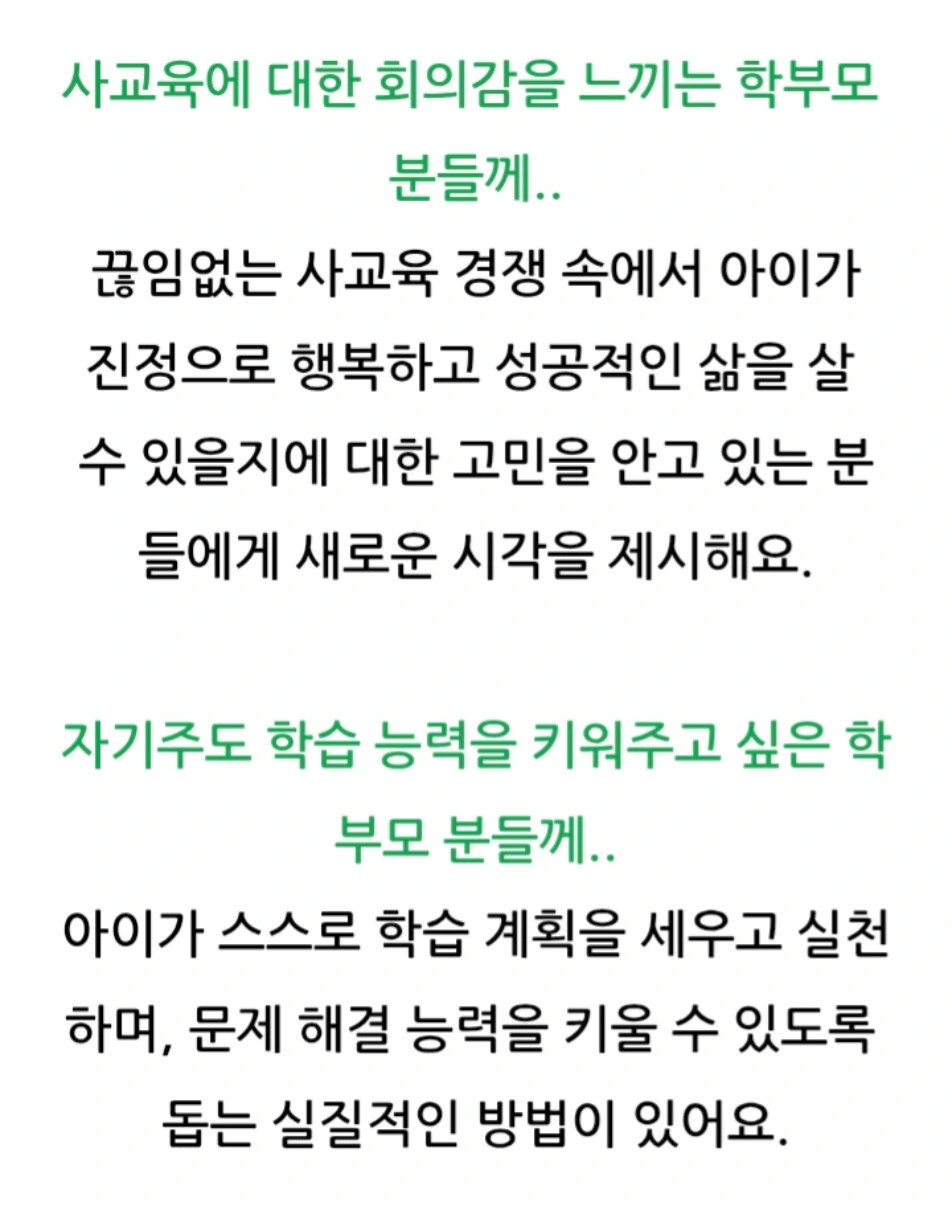 이 책은 사교육 없이 자녀를 과학고에 보낸 저자의 경험을 바탕으로, 부모의 역할과 가정 교육의 중요성을 강조해요.사교육 없이도 자녀를 최상위권으로 키울 수 있는 부모의 역할과 교육 노하우를 담고 있어요. 자녀의 잠재력을 최대한으로 이끌어내기 위한 부모의 마음가짐과 가정에서의 교육법을 제시합니다.